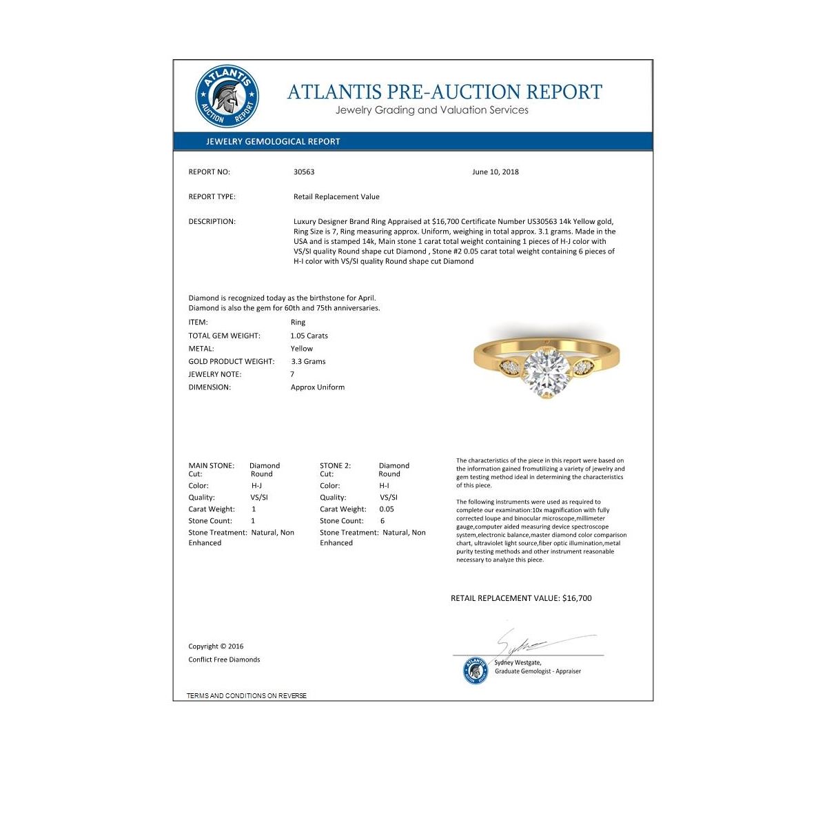 REF-278A8X -30563 ---- 1.05 CTW Certified VS/SI Diamond Solitaire Art Deco Ring 14K Yellow Gold ---- Luxury Designer Brand Ring Appraised at $16,700 Certificate Number US30563 14k Yellow gold, Ring Size is 7, Ring measuring approx. Uniform, weighing in total approx. 3.1 grams. Made in the USA and is stamped 14k, Main stone 1 carat total weight containing 1 pieces of H-J color with VS/SI quality Round shape cut Diamond , Stone #2 0.05 carat total weight containing 6 pieces of H-I color with VS/SI quality Round shape cut Diamond