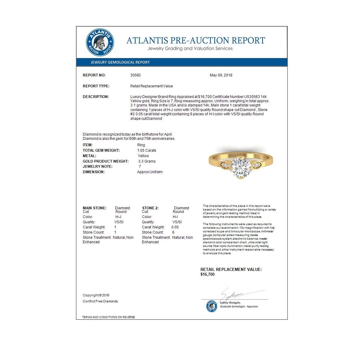 REF-278A8X -30563 ---- 1.05 CTW Certified VS/SI Diamond Solitaire Art Deco Ring 14K Yellow Gold ---- Luxury Designer Brand Ring Appraised at $16,700 Certificate Number US30563 14k Yellow gold, Ring Size is 7, Ring measuring approx. Uniform, weighing in total approx. 3.1 grams. Made in the USA and is stamped 14k, Main stone 1 carat total weight containing 1 pieces of H-J color with VS/SI quality Round shape cut Diamond , Stone #2 0.05 carat total weight containing 6 pieces of H-I color with VS/SI quality Round shape cut Diamond