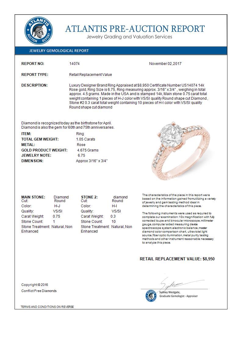 REF-180X9T -14074 ---- 1.05 CTW Certified VS/SI Diamond Solitaire Ring 14K Rose Gold ---- Luxury Designer Brand Ring Appraised at $8,950 Certificate Number US14074 14k Rose gold, Ring Size is 6.75, Ring measuring approx. 3/16" x 3/4" , weighing in total approx. 4.5 grams. Made in the USA and is stamped 14k, Main stone 0.75 carat total weight containing 1 pieces of H-J color with VS/SI quality Round shape cut Diamond , Stone #2 0.3 carat total weight containing 10 pieces of H-I color with VS/SI quality Round shape cut diamond