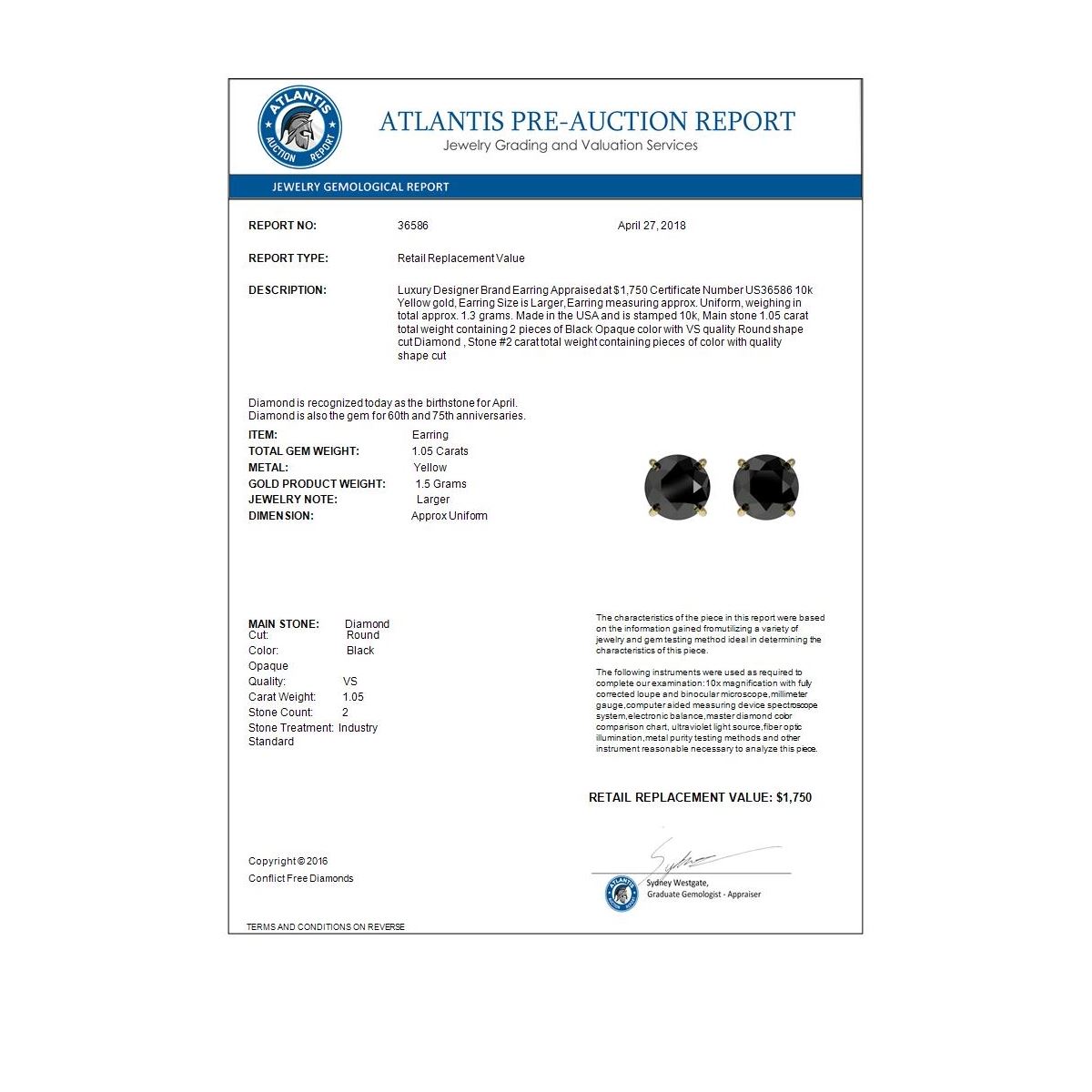 REF-25W9F -36586 ---- 1.05 CTW Fancy Black VS Diamond Solitaire Stud Earrings 10K Yellow Gold ---- Luxury Designer Brand Earring Appraised at $1,750 Certificate Number US36586 10k Yellow gold, Earring Size is Larger, Earring measuring approx. Uniform, weighing in total approx. 1.3 grams. Made in the USA and is stamped 10k, Main stone 1.05 carat total weight containing 2 pieces of Black Opaque color with VS quality Round shape cut Diamond , Stone #2 carat total weight containing pieces of color with quality shape cut