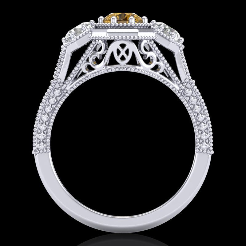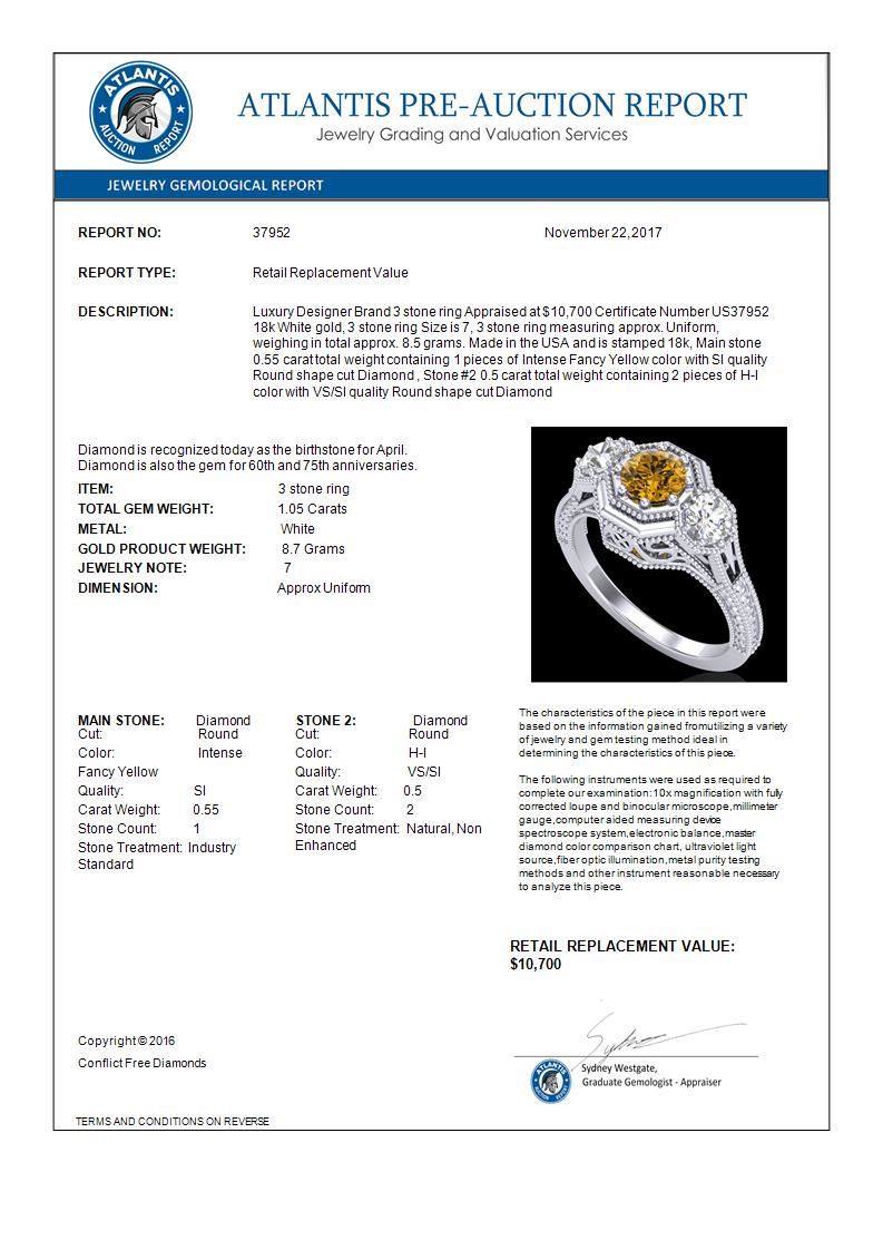 REF-161T8M -37952 ---- 1.05 CTW Intense Fancy Yellow Diamond Art Deco 3 Stone Ring 18K White Gold ---- Luxury Designer Brand 3 stone ring Appraised at $10,700 Certificate Number US37952 18k White gold, 3 stone ring Size is 7, 3 stone ring measuring approx. Uniform, weighing in total approx. 8.5 grams. Made in the USA and is stamped 18k, Main stone 0.55 carat total weight containing 1 pieces of Intense Fancy Yellow color with SI quality Round shape cut Diamond , Stone #2 0.5 carat total weight containing 2 pieces of H-I color with VS/SI quality Round shape cut Diamond