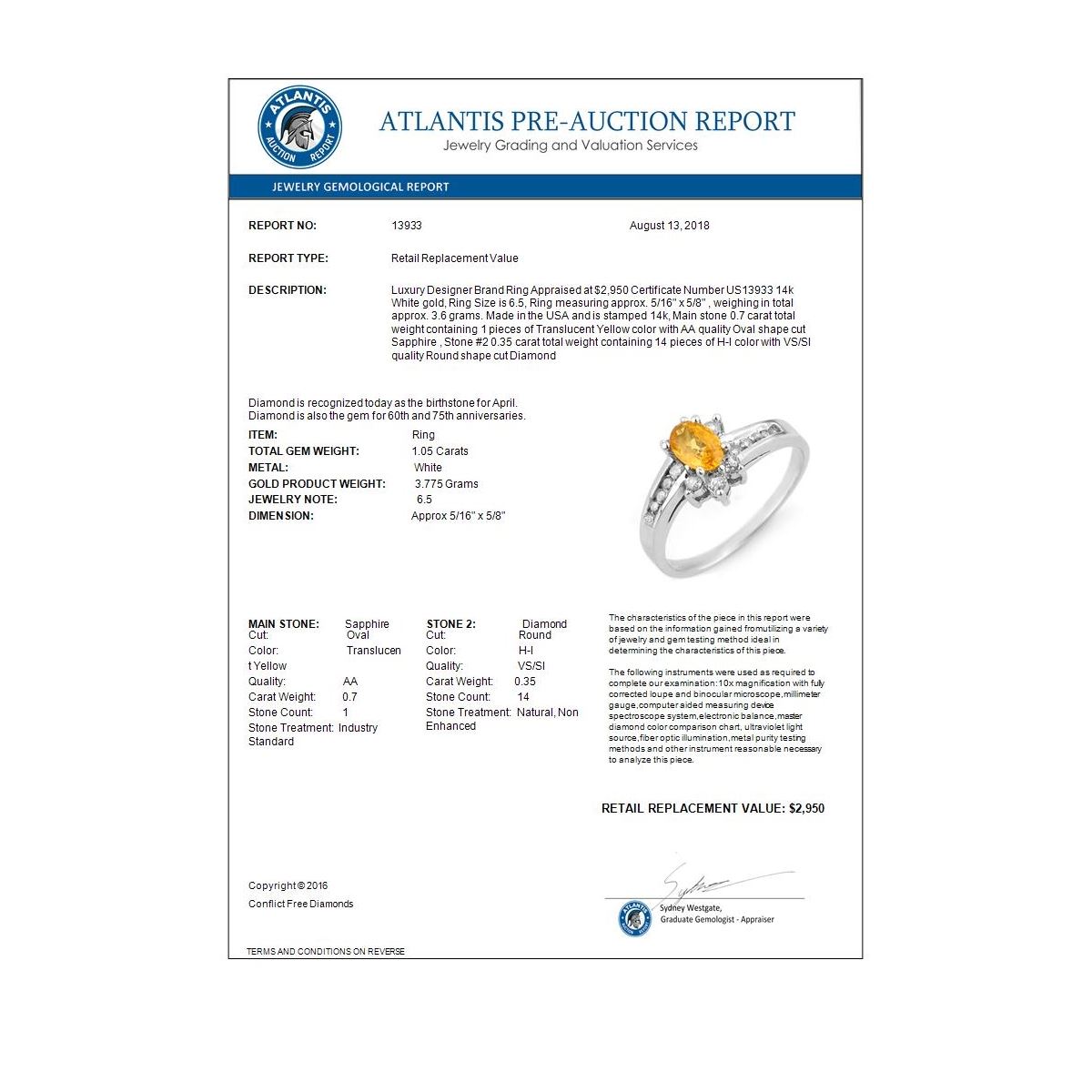 REF-41N3Y -13933 ---- 1.05 CTW Yellow Sapphire & Diamond Ring 14K White Gold ---- Luxury Designer Brand Ring Appraised at $2,950 Certificate Number US13933 14k White gold, Ring Size is 6.5, Ring measuring approx. 5/16" x 5/8" , weighing in total approx. 3.6 grams. Made in the USA and is stamped 14k, Main stone 0.7 carat total weight containing 1 pieces of Translucent Yellow color with AA quality Oval shape cut Sapphire , Stone #2 0.35 carat total weight containing 14 pieces of H-I color with VS/SI quality Round shape cut Diamond