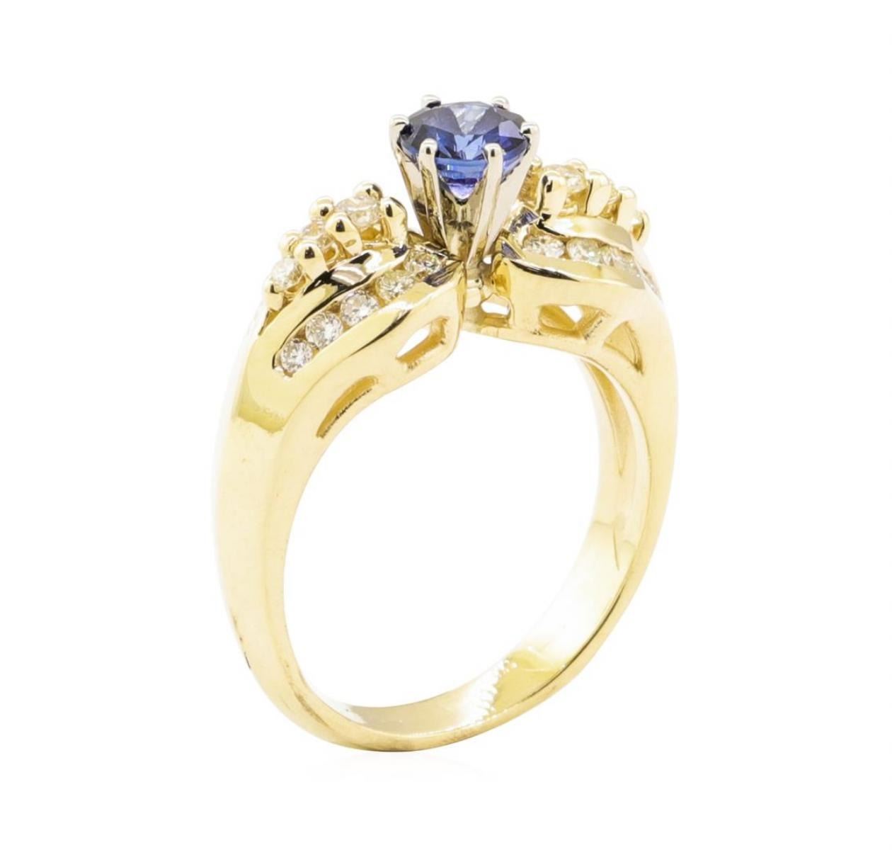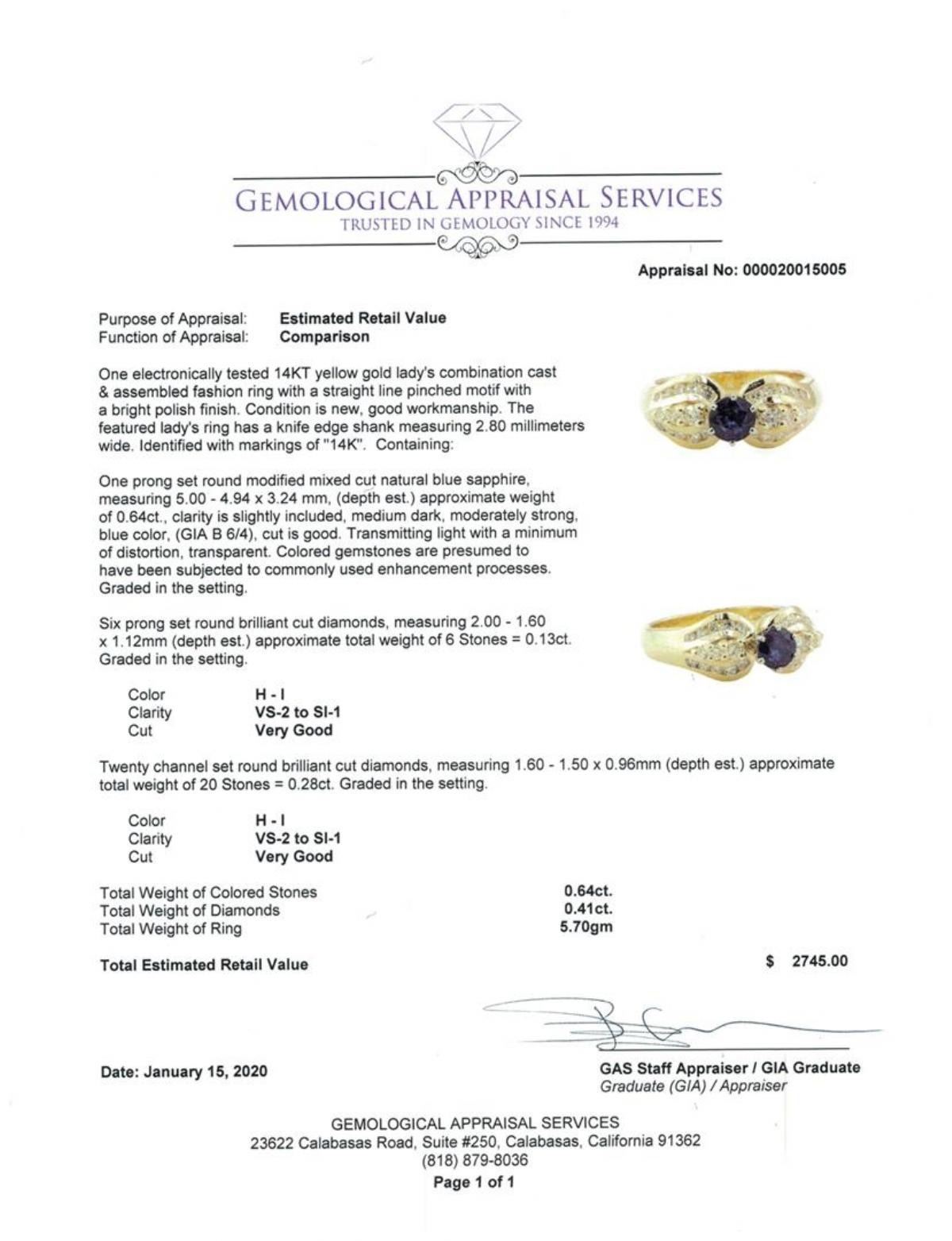 One electronically tested 14KT yellow gold lady's combination cast & assembled fashion ring with a straight line pinched motif with a bright polish finish. The featured lady's ring has a knife edge shank measuring 2.80 millimeters wide. Identified with markings of '14K'. Condition is new, good workmanship. Containing: One prong set round modified mixed cut natural blue sapphire, measuring 5.00 - 4.94 x 3.24 mm, (depth est.) approximate weight of 0.64ct., clarity is slightly included, medium dark, moderately strong, blue color, (GIA B 6/4), cut is good. Transmitting light with a minimum of distortion, transparent. Colored gemstones are presumed to have been subjected to commonly used enhancement processes. Graded in the setting. Six prong set round brilliant cut diamonds, measuring 2.00 - 1.60 x 1.12mm (depth est.) approximate total weight of 6 Stones = 0.13ct. Graded in the setting. Color H - I Clarity VS-2 to SI-1 Cut Very Good Twenty channel set round brilliant cut diamonds, measuring 1.60 - 1.50 x 0.96mm (depth est.) approximate total weight of 20 Stones = 0.28ct. Graded in the setting. Color H - I Clarity VS-2 to SI-1 Cut Very Good. Total Weight of Colored Stones 0.64ct.. Total Weight of Diamonds 0.41ct.. Total Weight of Ring 5.70gm GAS Appraised at $2745.00. GAS Appraised.