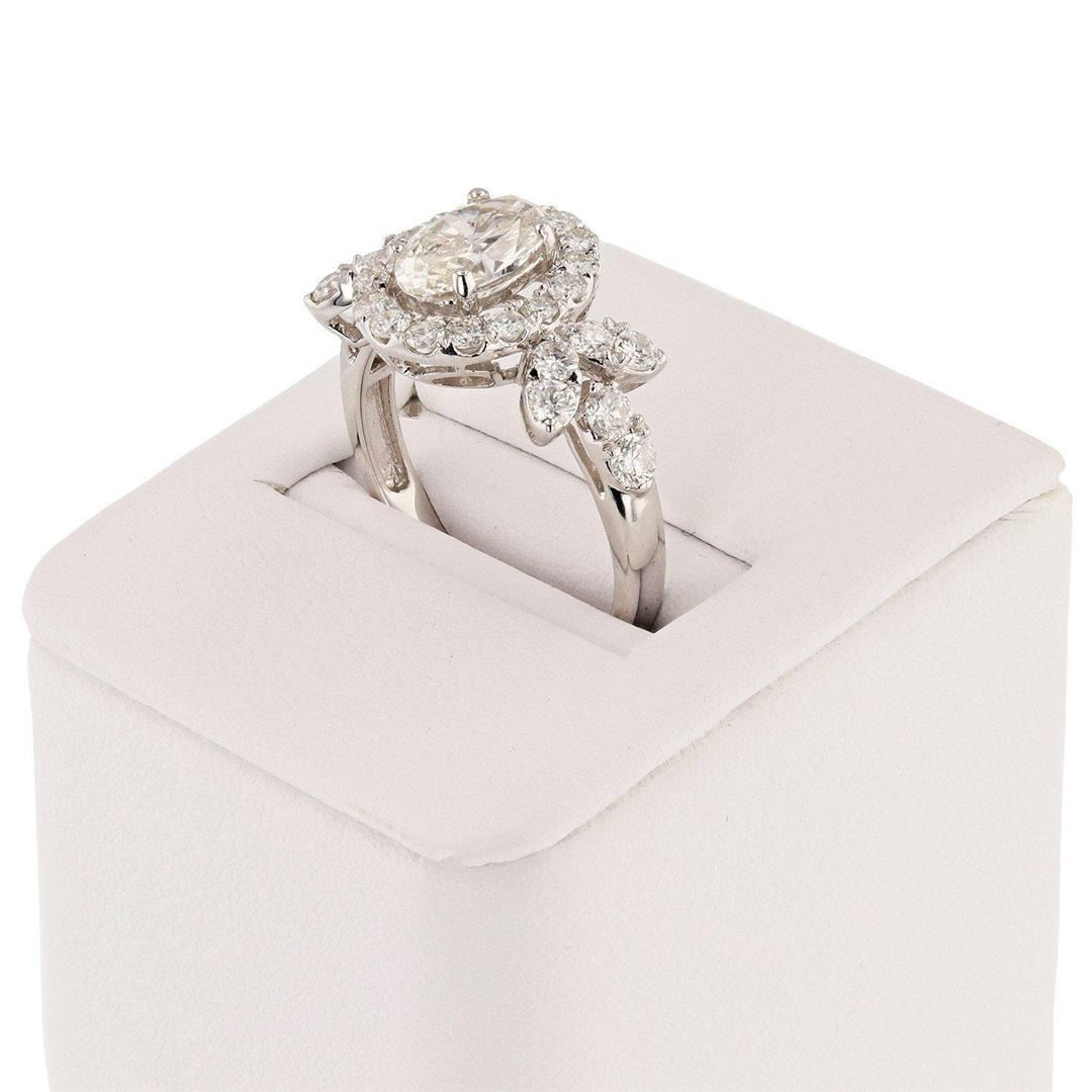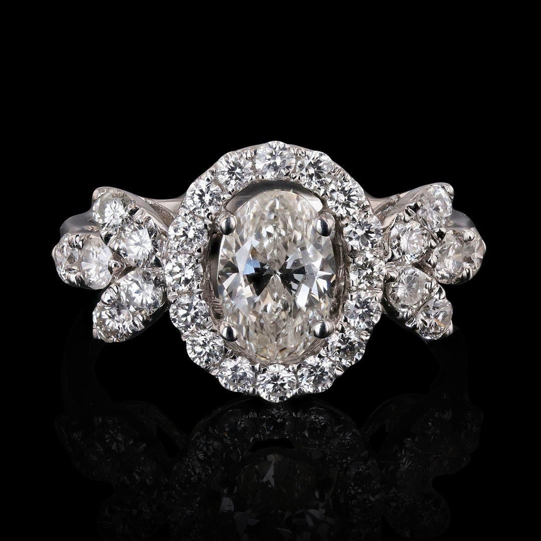 1.05ct CENTER Diamond 18K White Gold Ring (2.03ctw Diamonds). One electronically tested 18KT white gold ladies cast diamond unity ring. Condition is new, good workmanship. The featured diamond is set within a diamond bezel, framed by mirroring diamond set shoulders and a lattice under gallery, completed by a two millimeter wide band. Bright polish finish.Identified with "18K". Containing: One prong set oval shaped cut diamond, measuring 8.06 x 5.44 x 3.40mm (depth est.), 10.00% GTCF approximate weight of 1.05ct. Graded in the setting. Clarity I1 Color J Depth 62.5% Table 62.1% Polish Good Symmetry Good Twenty-eight prong set round brilliant cut diamonds approximate total weight of 28 Stones = 0.98ctw. Graded in the setting. Clarity VS2 to SI2 Color G - H Total Weight of Diamonds 2.03ctw. Total Weight of Ring 3.70 gm