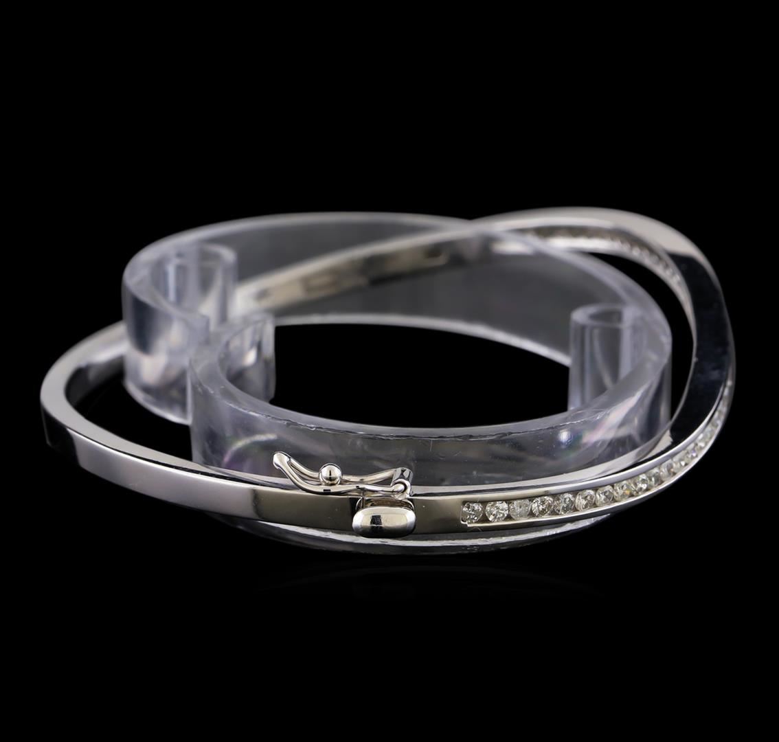 One electronically tested 14KT white gold ladies cast and assembled diamond bangle bracelet with a bright polish finish. Condition is new, good workmanship. Six and one-half inch length diamond set hinged bangle bracelet terminating in a concealed clasp with safety. Identified with markings of "14K". Containing: Forty-one channel set round brilliant cut diamonds, measuring 1.90 - 1.80 x 1.11mm (depth est.) approximate total weight of 41 Stones = 1.05ct. Graded in the setting. Clarity of I-1 to I-2, color of G-I. Total Weight of Diamonds: 1.05ct, Total Weight of Bangle Bracelet: 14.80 grams. AIG Appraised at $5,080.00.