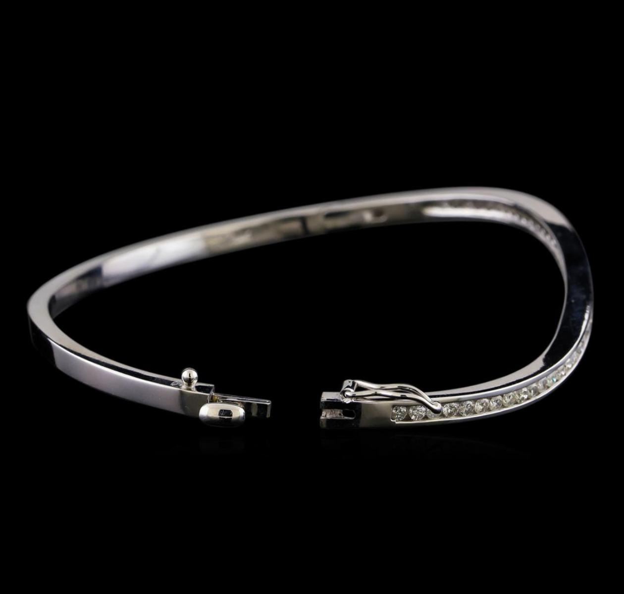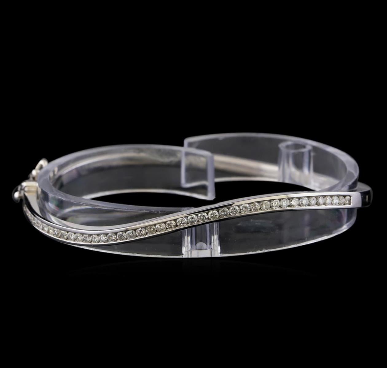 One electronically tested 14KT white gold ladies cast and assembled diamond bangle bracelet with a bright polish finish. Condition is new, good workmanship. Six and one-half inch length diamond set hinged bangle bracelet terminating in a concealed clasp with safety. Identified with markings of "14K". Containing: Forty-one channel set round brilliant cut diamonds, measuring 1.90 - 1.80 x 1.11mm (depth est.) approximate total weight of 41 Stones = 1.05ct. Graded in the setting. Clarity of I-1 to I-2, color of G-I. Total Weight of Diamonds: 1.05ct, Total Weight of Bangle Bracelet: 14.80 grams. AIG Appraised.