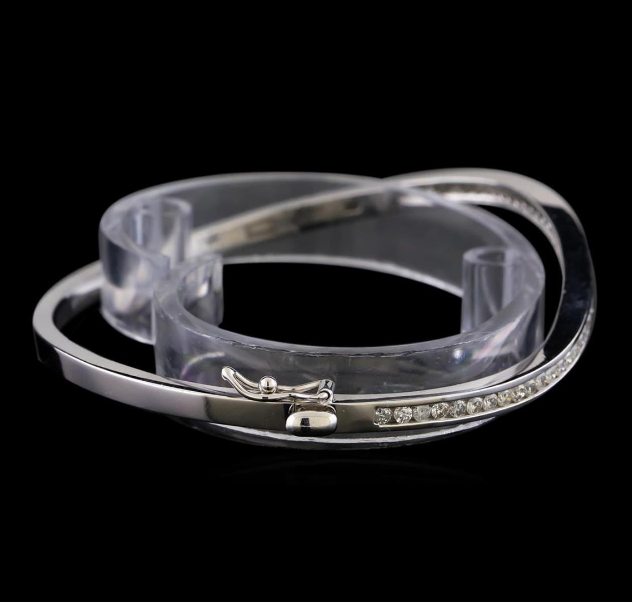 One electronically tested 14KT white gold ladies cast and assembled diamond bangle bracelet with a bright polish finish. Condition is new, good workmanship. Six and one-half inch length diamond set hinged bangle bracelet terminating in a concealed clasp with safety. Identified with markings of "14K". Containing: Forty-one channel set round brilliant cut diamonds, measuring 1.90 - 1.80 x 1.11mm (depth est.) approximate total weight of 41 Stones = 1.05ct. Graded in the setting. Clarity of I-1 to I-2, color of G-I. Total Weight of Diamonds: 1.05ct, Total Weight of Bangle Bracelet: 14.80 grams. AIG Appraised.