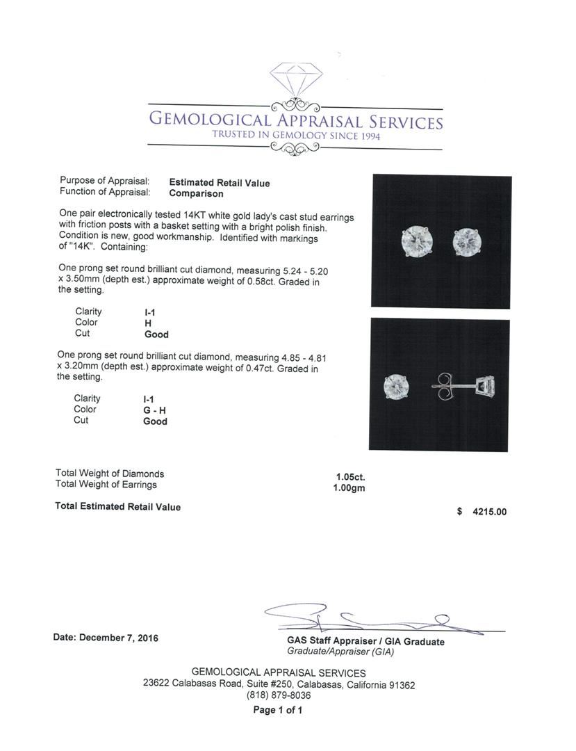 One pair electronically tested 14KT white gold lady's cast stud earrings with friction posts with a basket setting with a bright polish finish. Identified with markings of '14K'. Condition is new, good workmanship. Containing: One prong set round brilliant cut diamond, measuring 5.24 - 5.20 x 3.50mm (depth est.) approximate weight of 0.58ct. Graded in the setting. Clarity I-1. Color: H Cut Good One prong set round brilliant cut diamond, measuring 4.85 - 4.81 x 3.20mm (depth est.) approximate weight of 0.47ct. Graded in the setting. Clarity I-1. Color: G - H Cut Good. Total Weight of Diamonds 1.05ct.. Total Weight of Earrings 1.00gm. GAS Appraised at $4,215.00.