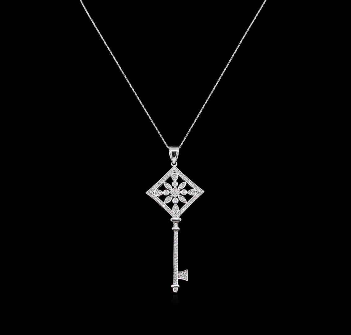 One key pendant with chain featuring: 14KT white gold weighing 8.07 grams containing pave set round diamonds with a total weight of 1.05ct.