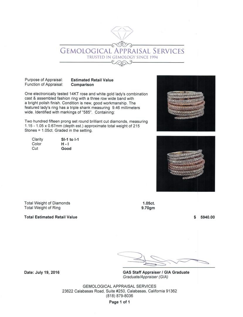 One electronically tested 14KT rose and white gold lady's combination cast & assembled fashion ring with a three row wide band with a bright polish finish. The featured lady's ring has a triple shank measuring 9.46 millimeters wide. Identified with markings of '585'. Condition is new, good workmanship. Containing: Two Hundred Fifteen prong set round brilliant cut diamonds, measuring 1.15 - 1.05 x 0.67mm (depth est.) approximate total weight of 215 Stones = 1.05ct. Graded in the setting. Clarity SI-1 to I-1. Color: H - I Cut Good. Total Weight of Diamonds 1.05ct.. Total Weight of Ring 9.70gm. GAS Appraised at $5,940.00.