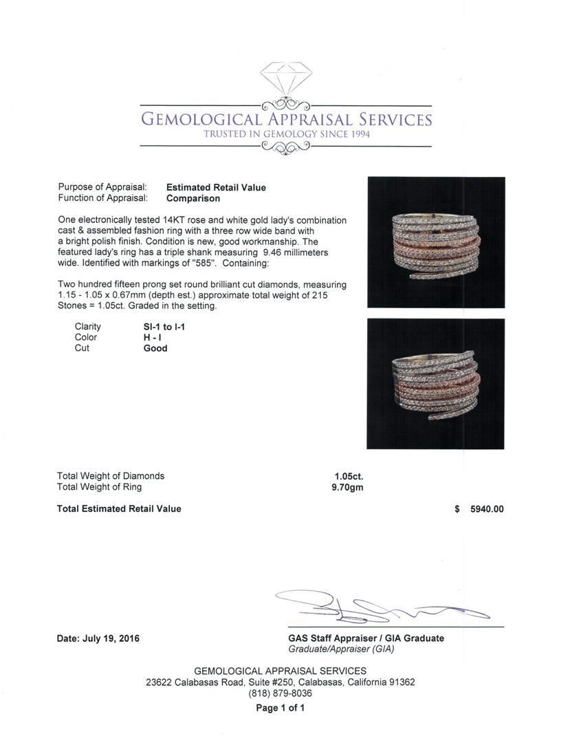 One electronically tested 14KT rose and white gold lady's combination cast & assembled fashion ring with a three row wide band with a bright polish finish. The featured lady's ring has a triple shank measuring 9.46 millimeters wide. Identified with markings of '585'. Condition is new, good workmanship. Containing: Two Hundred Fifteen prong set round brilliant cut diamonds, measuring 1.15 - 1.05 x 0.67mm (depth est.) approximate total weight of 215 Stones = 1.05ct. Graded in the setting. Clarity SI-1 to I-1. Color: H - I Cut Good. Total Weight of Diamonds 1.05ct.. Total Weight of Ring 9.70gm. GAS Appraised.