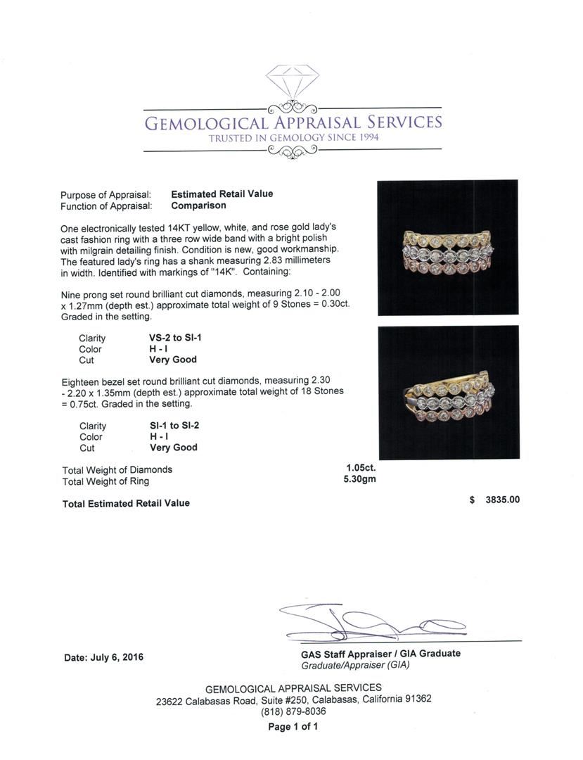 One electronically tested 14KT yellow, white, and rose gold lady's cast fashion ring with a three row wide band with a bright polish with milgrain detailing finish. The featured lady's ring has a shank measuring 2.83 millimeters in width. Identified with markings of '14K'. Condition is new, good workmanship. Containing: Nine prong set round brilliant cut diamonds, measuring 2.10 - 2.00 x 1.27mm (depth est.) approximate total weight of 9 Stones = 0.30ct. Graded in the setting. Clarity VS-2 to SI-1. Color: H - I Cut Very Good Eighteen bezel set round brilliant cut diamonds, measuring 2.30 - 2.20 x 1.35mm (depth est.) approximate total weight of 18 Stones = 0.75ct. Graded in the setting. Clarity SI-1 to SI-2. Color: H - I Cut Very Good. Total Weight of Diamonds 1.05ct.. Total Weight of Ring 5.30gm. GAS Appraised at $3,835.00.