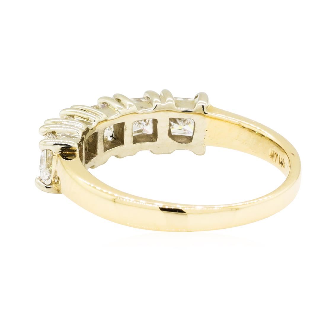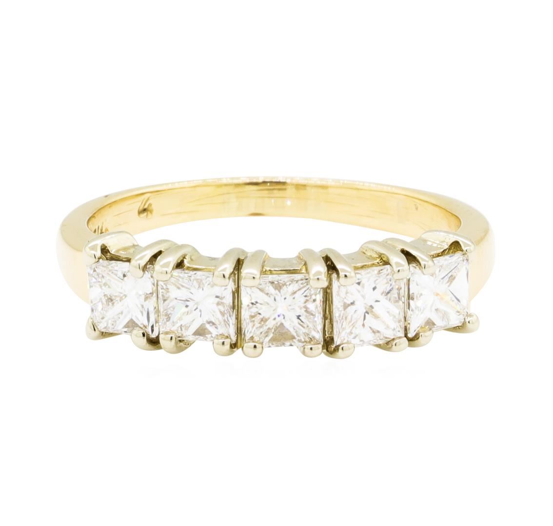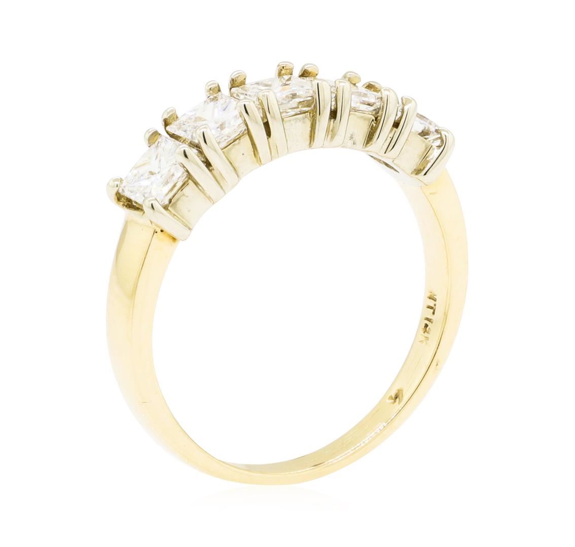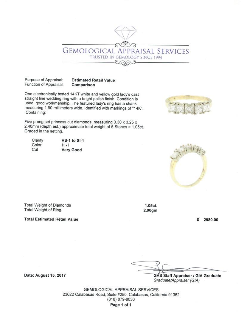 One electronically tested 14KT white and yellow gold lady's cast straight line wedding ring with a bright polish finish. The featured lady's ring has a shank measuring 1.90 millimeters wide. Identified with markings of '14K'. Condition is used, good workmanship. Containing: Five prong set princess cut diamonds, measuring 3.30 x 3.25 x 2.40mm (depth est.) approximate total weight of 5 Stones = 1.05ct. Graded in the setting. Color H - I Clarity VS-1 to SI-1 Cut Very Good. Total Weight of Diamonds 1.05ct.. Total Weight of Ring 2.90gm GAS Appraised at $2980.00. GAS Appraised at $2,980.00.