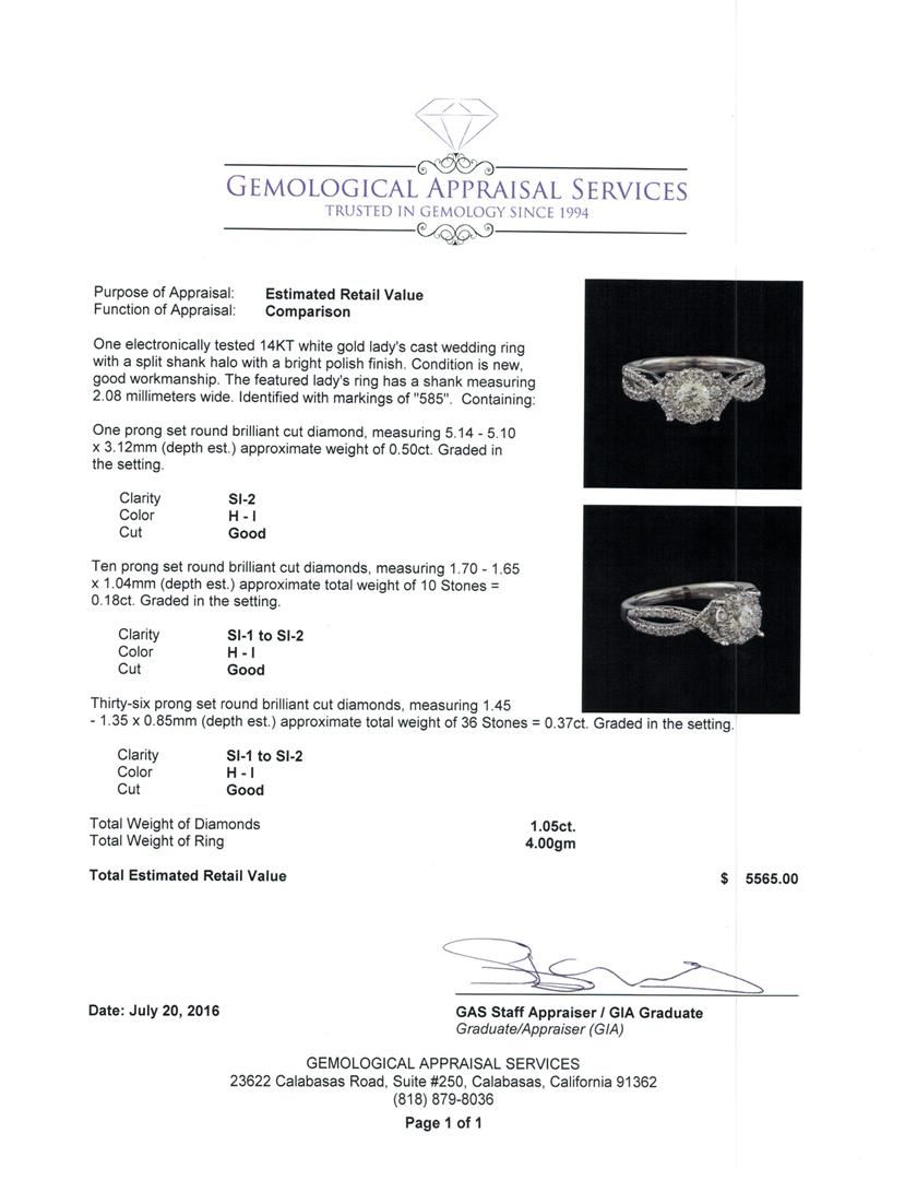 One electronically tested 14KT white gold lady's cast wedding ring with a split shank halo with a bright polish finish. The featured lady's ring has a shank measuring 2.08 millimeters wide. Identified with markings of '585'. Condition is new, good workmanship. Containing: One prong set round brilliant cut diamond, measuring 5.14 - 5.10 x 3.12mm (depth est.) approximate weight of 0.50ct. Graded in the setting. Clarity SI-2. Color: H - I Cut Good Ten prong set round brilliant cut diamonds, measuring 1.70 - 1.65 x 1.04mm (depth est.) approximate total weight of 10 Stones = 0.18ct. Graded in the setting. Clarity SI-1 to SI-2. Color: H - I Cut Good Thirty-Six prong set round brilliant cut diamonds, measuring 1.45 - 1.35 x 0.85mm (depth est.) approximate total weight of 36 Stones = 0.37ct. Graded in the setting. Clarity SI-1 to SI-2. Color: H - I Cut Good. Total Weight of Diamonds 1.05ct.. Total Weight of Ring 4.00gm. GAS Appraised at $5,565.00.
