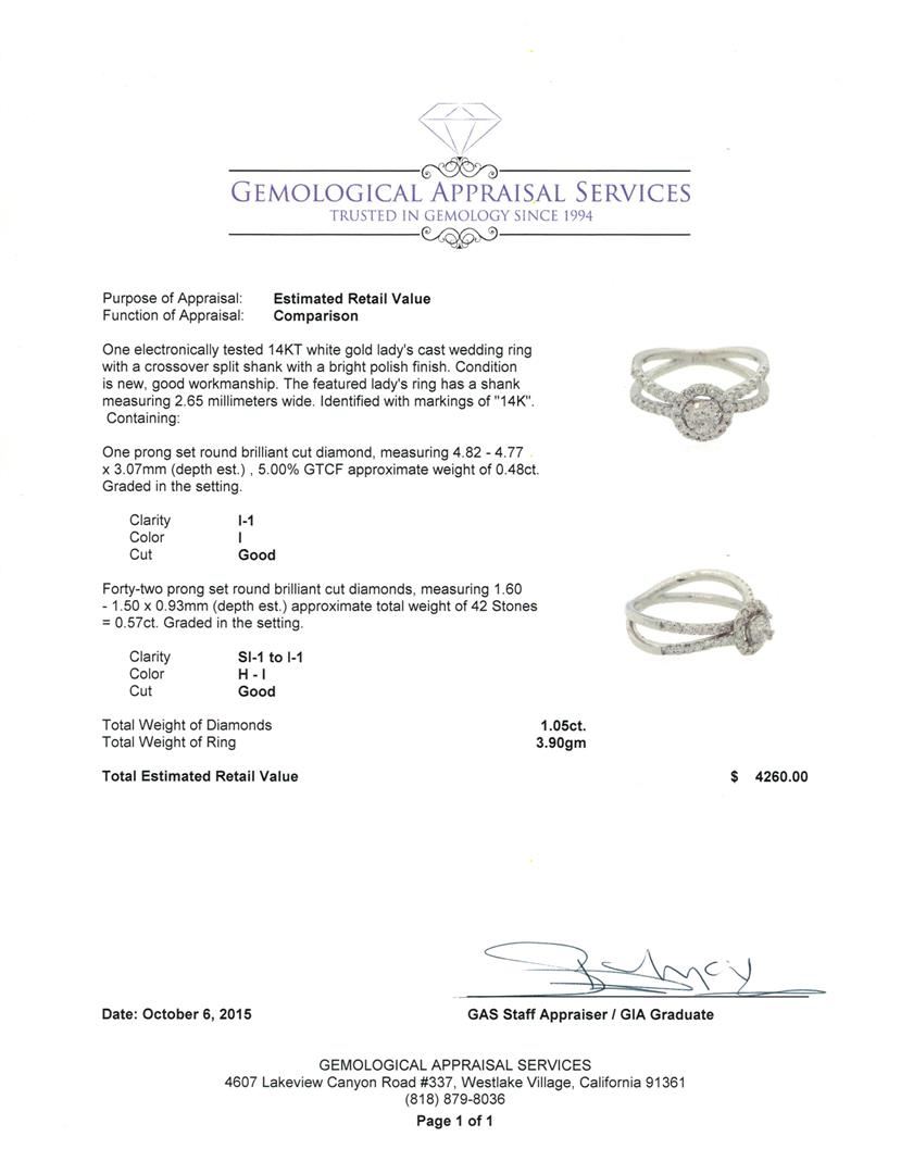 One electronically tested 14KT white gold lady's cast wedding ring with a crossover split shank with a bright polish finish. The featured lady's ring has a shank measuring 2.65 millimeters wide. Identified with markings of "14K". Condition is new, good workmanship. Containing: One prong set round brilliant cut diamond, measuring 4.82 - 4.77 x 3.07mm (depth est.) , 5.00.%. GTCF approximate weight of 0.48ct. Graded in the setting. Clarity: I-1. Color: I. Cut Good Forty-Two prong set round brilliant cut diamonds, measuring 1.60 - 1.50 x 0.93mm (depth est.) approximate total weight of 42 Stones = 0.57ct. Graded in the setting. Clarity: SI-1 to I-1. Color: H - I. Cut Good. Total Weight of Diamonds 1.05ct. Total Weight of Ring 3.90gm. GAS Appraised at $4,260.00.