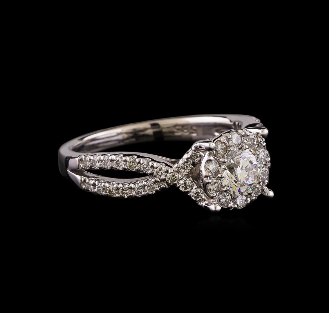 One electronically tested 14KT white gold lady's cast wedding ring with a split shank halo with a bright polish finish. The featured lady's ring has a shank measuring 2.08 millimeters wide. Identified with markings of '585'. Condition is new, good workmanship. Containing: One prong set round brilliant cut diamond, measuring 5.14 - 5.10 x 3.12mm (depth est.) approximate weight of 0.50ct. Graded in the setting. Clarity SI-2. Color: H - I Cut Good Ten prong set round brilliant cut diamonds, measuring 1.70 - 1.65 x 1.04mm (depth est.) approximate total weight of 10 Stones = 0.18ct. Graded in the setting. Clarity SI-1 to SI-2. Color: H - I Cut Good Thirty-Six prong set round brilliant cut diamonds, measuring 1.45 - 1.35 x 0.85mm (depth est.) approximate total weight of 36 Stones = 0.37ct. Graded in the setting. Clarity SI-1 to SI-2. Color: H - I Cut Good. Total Weight of Diamonds 1.05ct.. Total Weight of Ring 4.00gm. GAS Appraised at $5,565.00.