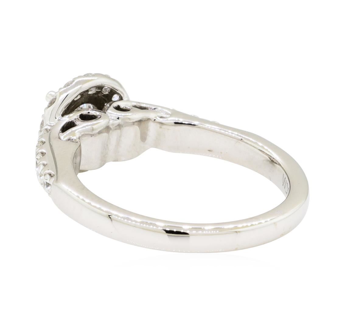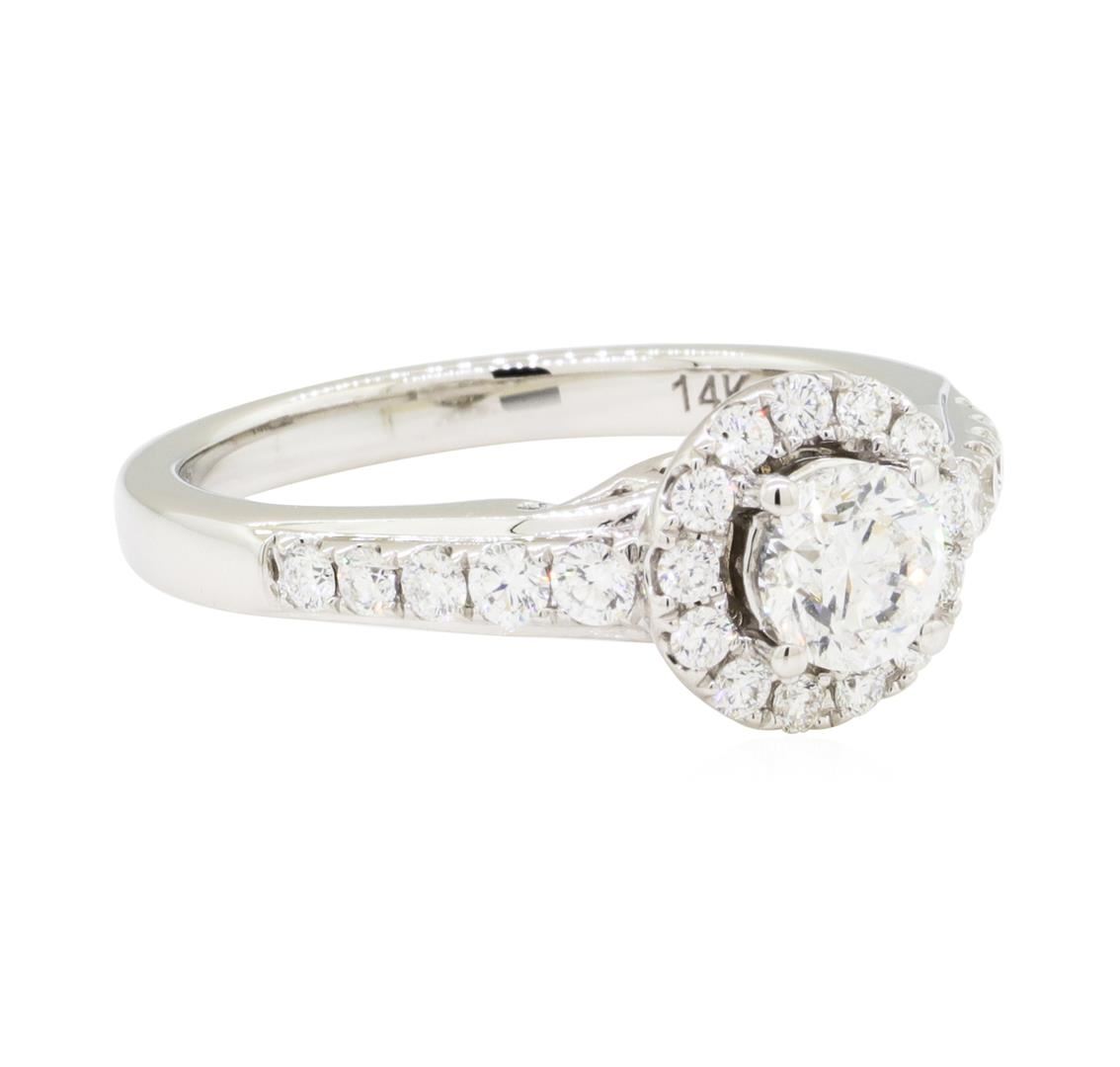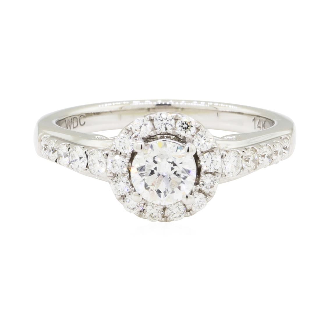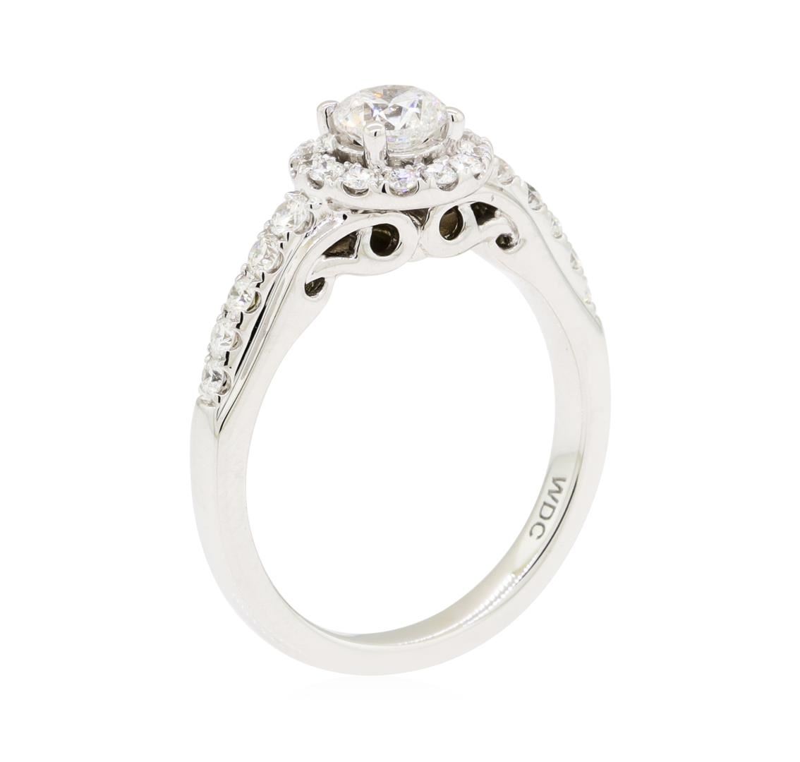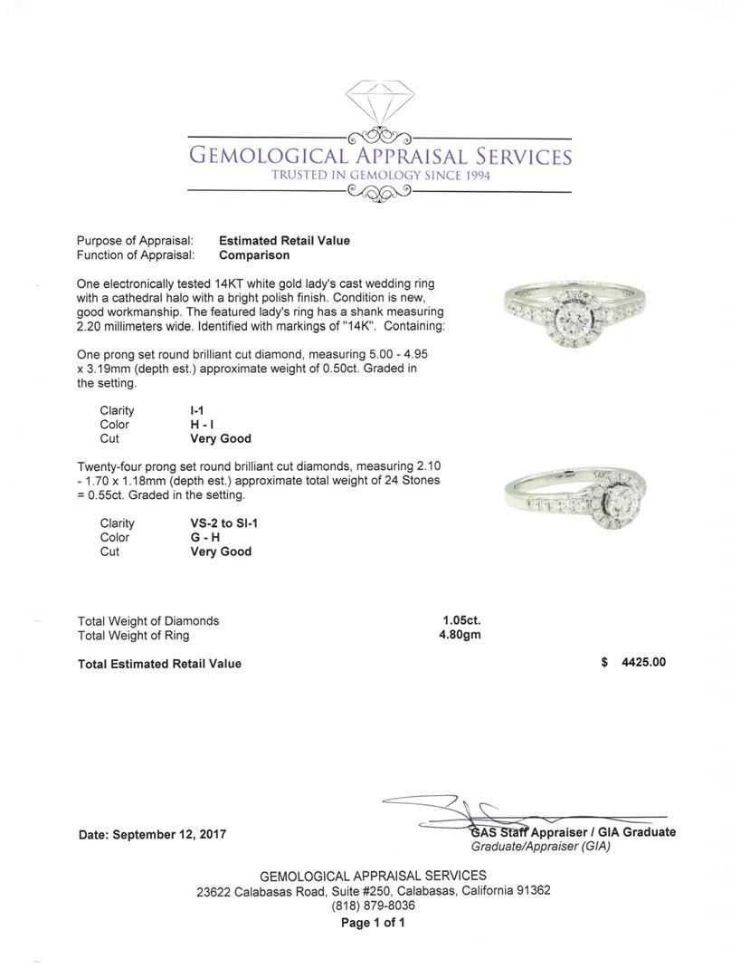 One electronically tested 14KT white gold lady's cast wedding ring with a cathedral halo with a bright polish finish. The featured lady's ring has a shank measuring 2.20 millimeters wide. Identified with markings of '14K'. Condition is new, good workmanship. Containing: One prong set round brilliant cut diamond, measuring 5.00 - 4.95 x 3.19mm (depth est.) approximate weight of 0.50ct. Graded in the setting. Color H - I Clarity I-1 Cut Very Good Twenty-Four prong set round brilliant cut diamonds, measuring 2.10 - 1.70 x 1.18mm (depth est.) approximate total weight of 24 Stones = 0.55ct. Graded in the setting. Color G - H Clarity VS-2 to SI-1 Cut Very Good. Total Weight of Diamonds 1.05ct.. Total Weight of Ring 4.80gm GAS Appraised at $4425.00. GAS Appraised at $4,425.00.
