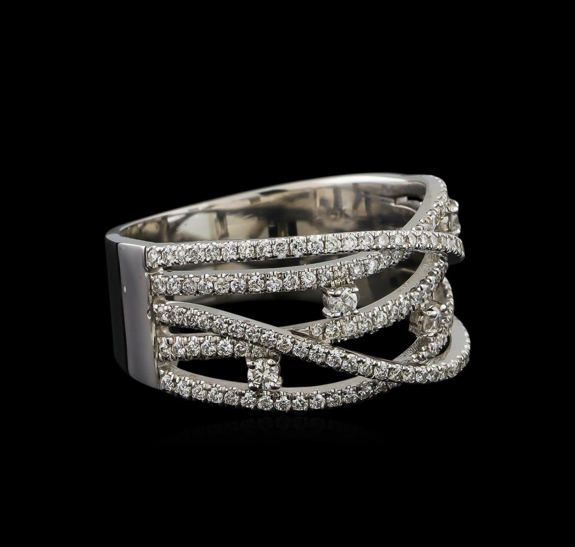 One electronically tested 14KT white gold lady's cast fashion ring with a crossover split shank with a bright polish finish. The featured lady's ring has a shank measuring 7.17 millimeters wide. Identified with markings of "14K". Condition is new, good workmanship. Containing: Four prong set round brilliant cut diamonds, measuring 2.30 - 2.20 x 1.40mm (depth est.) approximate total weight of 4 Stones = 0.18ct. Graded in the setting. Clarity: SI-1 to I-1. Color: H - I. Cut Good One Hundred Fifty-One prong set round brilliant cut diamonds, measuring 1.20 - 1.10 x 0.71mm (depth est.) approximate total weight of 151 Stones = 0.87ct. Graded in the setting. Clarity: SI-1 to SI-2. Color: H - I. Cut Good. Total Weight of Diamonds 1.05ct. Total Weight of Ring 8.50gm GAS Appraised at $5,055.00.
