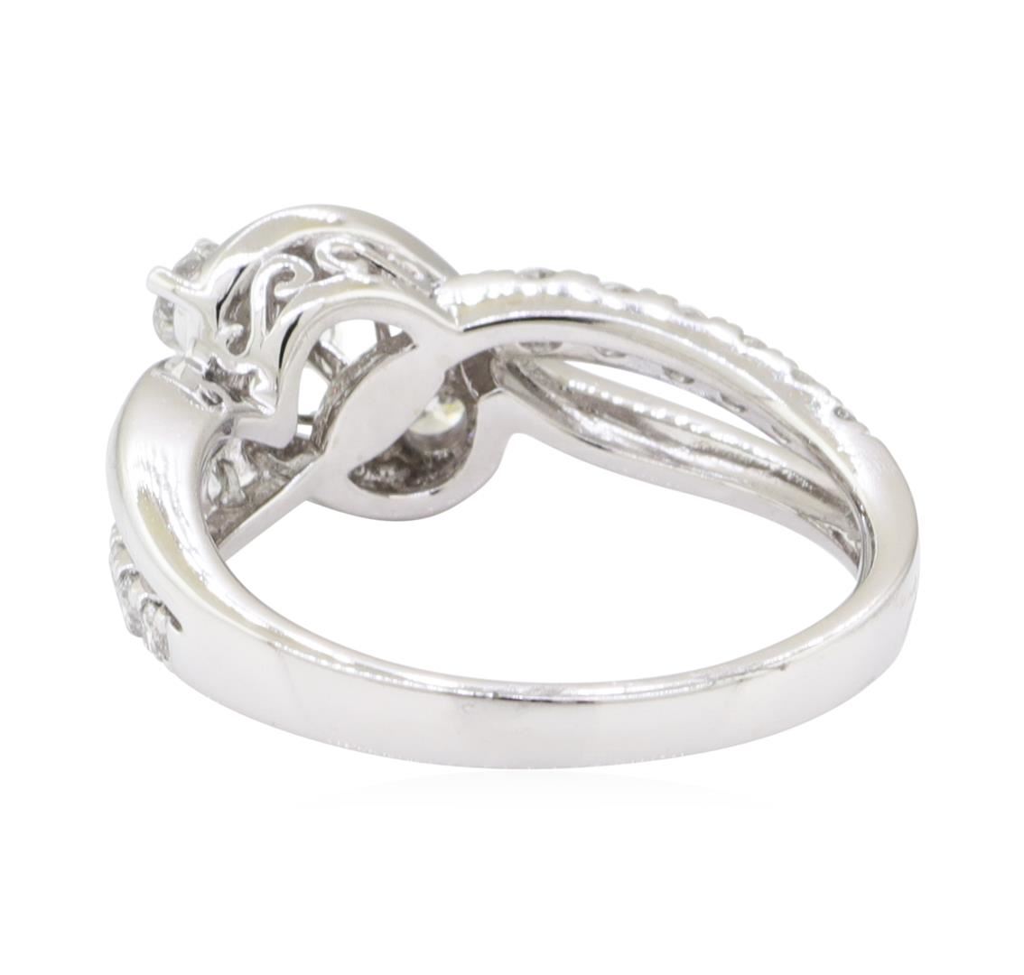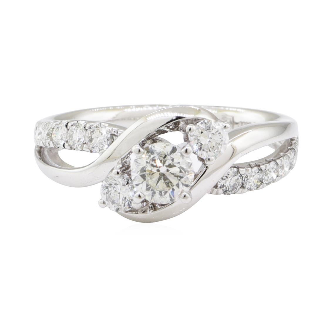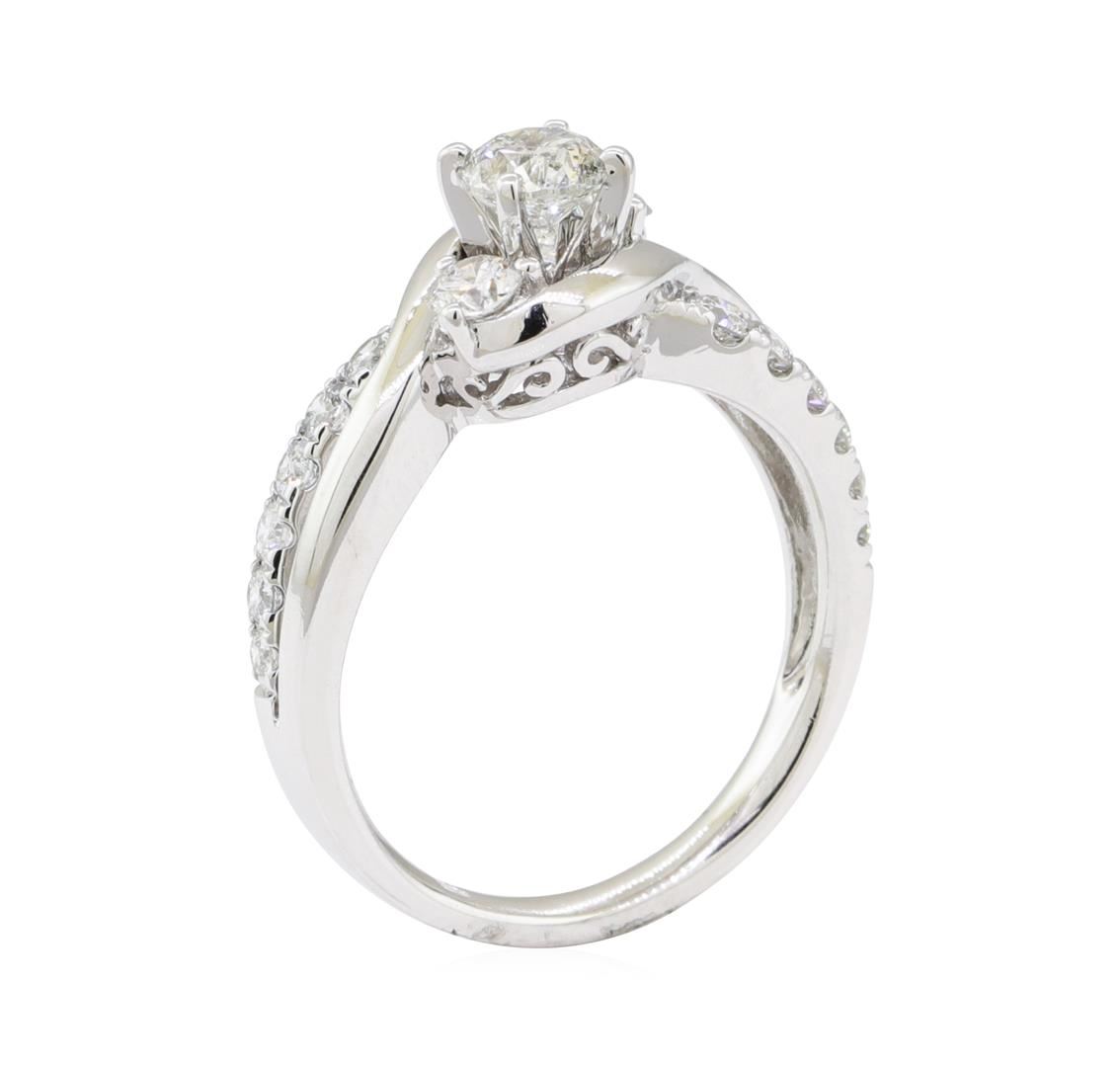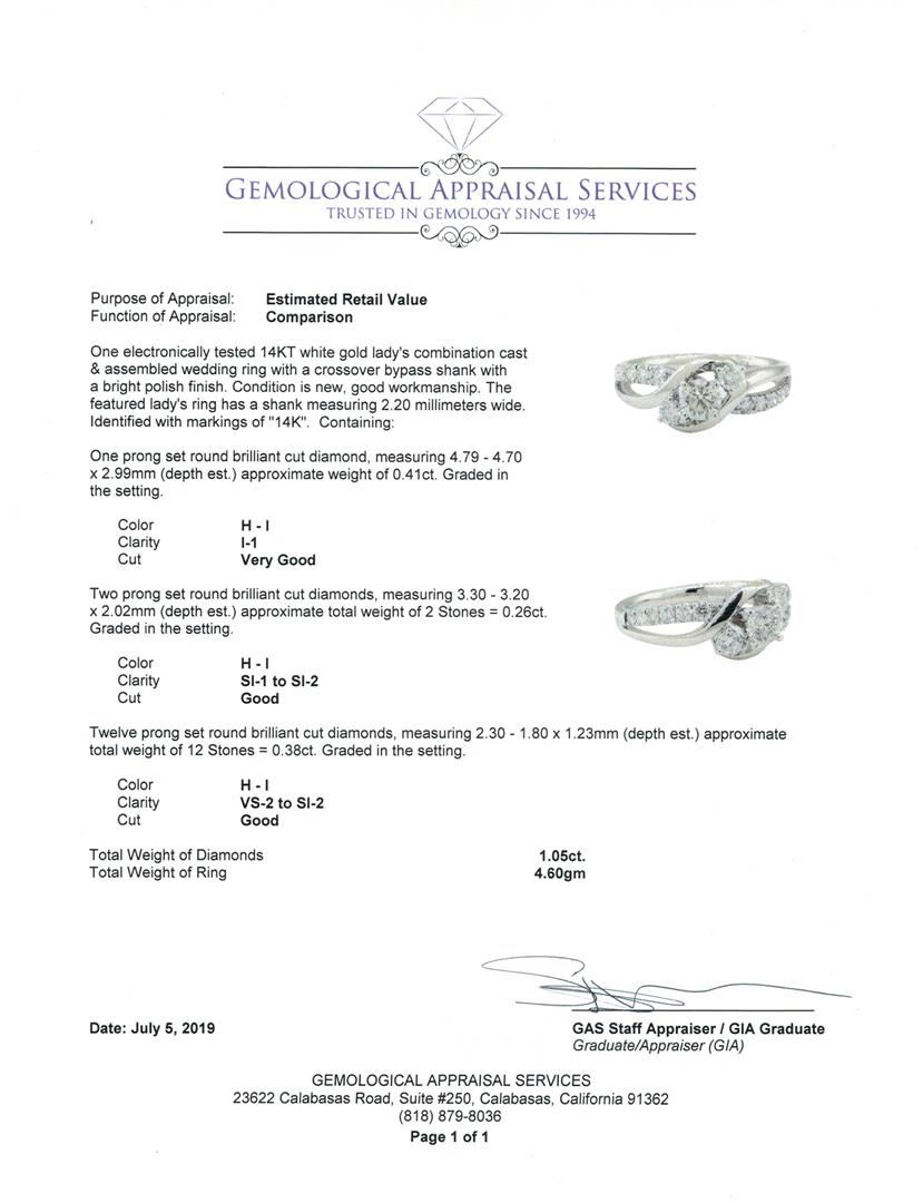 One electronically tested 14KT white gold lady's combination cast & assembled wedding ring with a crossover bypass shank with a bright polish finish. The featured lady's ring has a shank measuring 2.20 millimeters wide. Identified with markings of '14K'. Condition is new, good workmanship. Containing: One prong set round brilliant cut diamond, measuring 4.79 - 4.70 x 2.99mm (depth est.) approximate weight of 0.41ct. Graded in the setting. Color H - I Clarity I-1 Cut Very Good Two prong set round brilliant cut diamonds, measuring 3.30 - 3.20 x 2.02mm (depth est.) approximate total weight of 2 Stones = 0.26ct. Graded in the setting. Color H - I Clarity SI-1 to SI-2 Cut Good Twelve prong set round brilliant cut diamonds, measuring 2.30 - 1.80 x 1.23mm (depth est.) approximate total weight of 12 Stones = 0.38ct. Graded in the setting. Color H - I Clarity VS-2 to SI-2 Cut Good. Total Weight of Diamonds 1.05ct.. Total Weight of Ring 4.60gm GAS Appraised at $3405.00. GAS Appraised at $3,405.00.