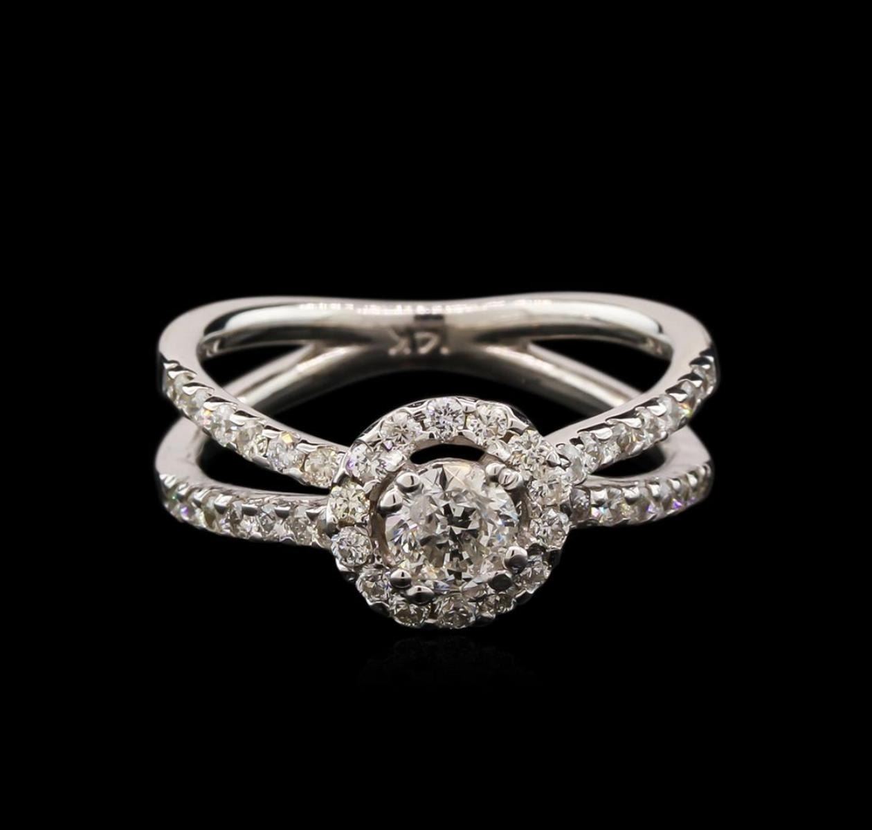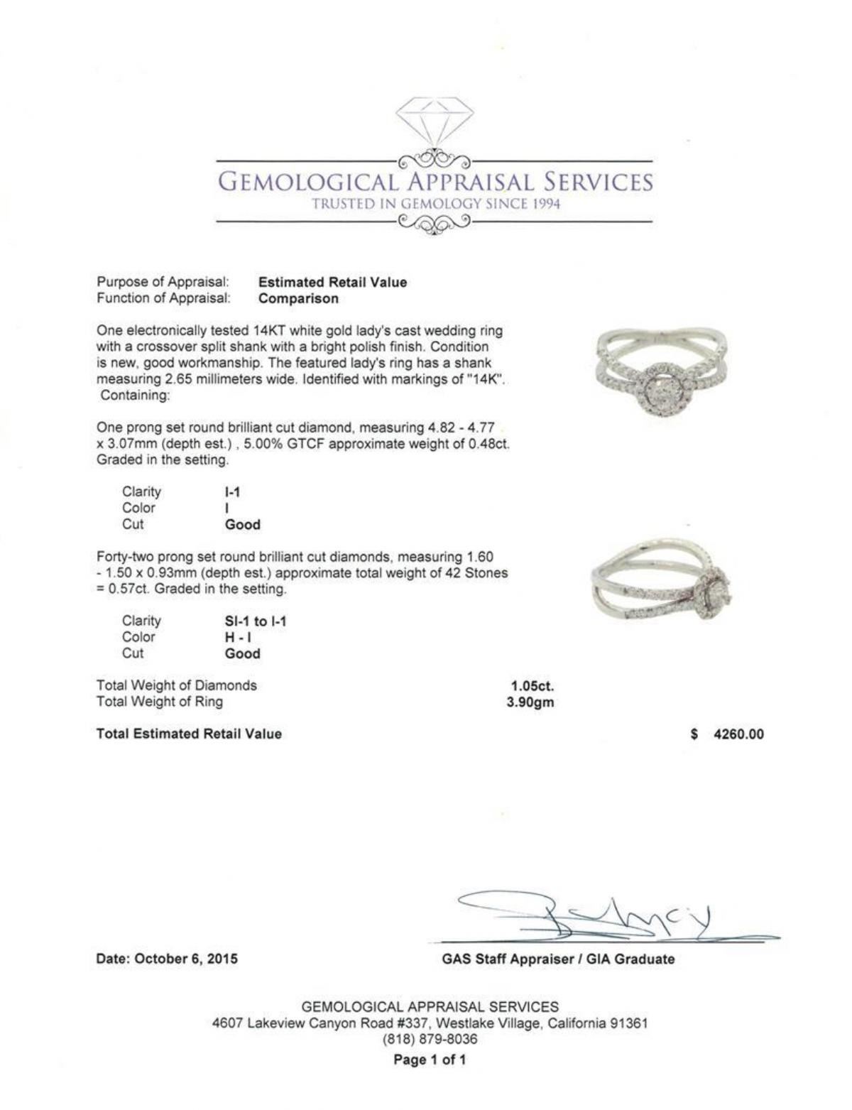 One electronically tested 14KT white gold lady's cast wedding ring with a crossover split shank with a bright polish finish. The featured lady's ring has a shank measuring 2.65 millimeters wide. Identified with markings of "14K". Condition is new, good workmanship. Containing: One prong set round brilliant cut diamond, measuring 4.82 - 4.77 x 3.07mm (depth est.) , 5.00.%. GTCF approximate weight of 0.48ct. Graded in the setting. Clarity: I-1. Color: I. Cut Good Forty-Two prong set round brilliant cut diamonds, measuring 1.60 - 1.50 x 0.93mm (depth est.) approximate total weight of 42 Stones = 0.57ct. Graded in the setting. Clarity: SI-1 to I-1. Color: H - I. Cut Good. Total Weight of Diamonds 1.05ct. Total Weight of Ring 3.90gm. GAS Appraised.
