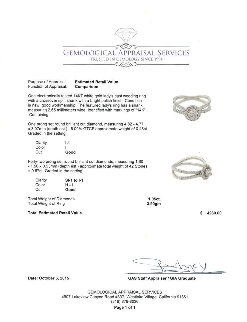 One electronically tested 14KT white gold lady's cast wedding ring with a crossover split shank with a bright polish finish. The featured lady's ring has a shank measuring 2.65 millimeters wide. Identified with markings of "14K". Condition is new, good workmanship. Containing: One prong set round brilliant cut diamond, measuring 4.82 - 4.77 x 3.07mm (depth est.) , 5.00.%. GTCF approximate weight of 0.48ct. Graded in the setting. Clarity: I-1. Color: I. Cut Good Forty-Two prong set round brilliant cut diamonds, measuring 1.60 - 1.50 x 0.93mm (depth est.) approximate total weight of 42 Stones = 0.57ct. Graded in the setting. Clarity: SI-1 to I-1. Color: H - I. Cut Good. Total Weight of Diamonds 1.05ct. Total Weight of Ring 3.90gm. GAS Appraised.