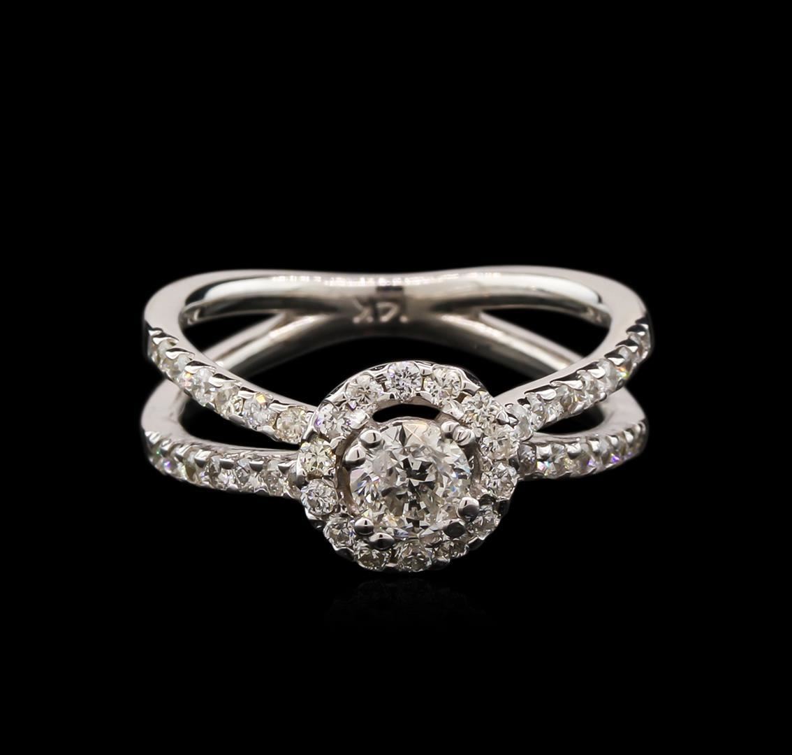 One electronically tested 14KT white gold lady's cast wedding ring with a crossover split shank with a bright polish finish. The featured lady's ring has a shank measuring 2.65 millimeters wide. Identified with markings of "14K". Condition is new, good workmanship. Containing: One prong set round brilliant cut diamond, measuring 4.82 - 4.77 x 3.07mm (depth est.) , 5.00.%. GTCF approximate weight of 0.48ct. Graded in the setting. Clarity: I-1. Color: I. Cut Good Forty-Two prong set round brilliant cut diamonds, measuring 1.60 - 1.50 x 0.93mm (depth est.) approximate total weight of 42 Stones = 0.57ct. Graded in the setting. Clarity: SI-1 to I-1. Color: H - I. Cut Good. Total Weight of Diamonds 1.05ct. Total Weight of Ring 3.90gm. GAS Appraised.