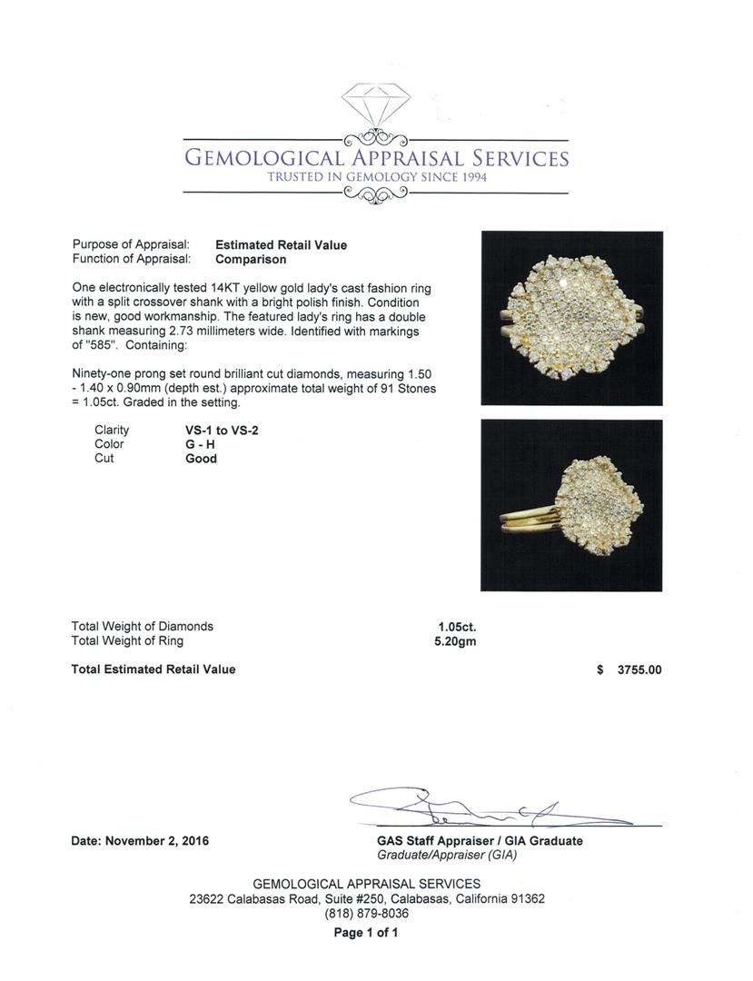 One electronically tested 14KT yellow gold lady's cast fashion ring with a split crossover shank with a bright polish finish. The featured lady's ring has a double shank measuring 2.73 millimeters wide. Identified with markings of '585'. Condition is new, good workmanship. Containing: Ninety-One prong set round brilliant cut diamonds, measuring 1.50 - 1.40 x 0.90mm (depth est.) approximate total weight of 91 Stones = 1.05ct. Graded in the setting. Clarity VS-1 to VS-2. Color: G - H Cut Good. Total Weight of Diamonds 1.05ct.. Total Weight of Ring 5.20gm. GAS Appraised at $3,755.00.