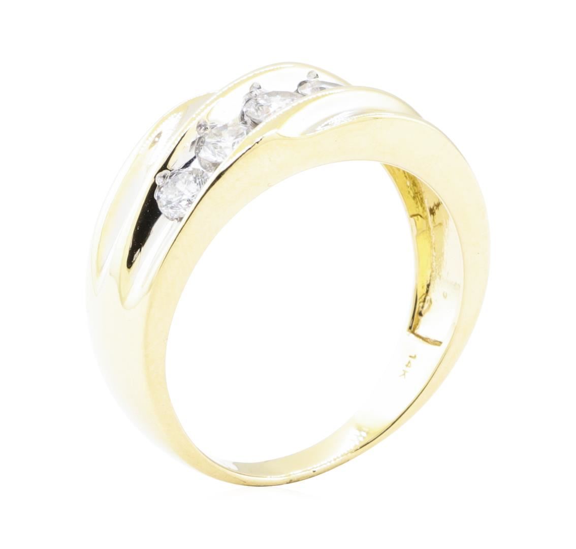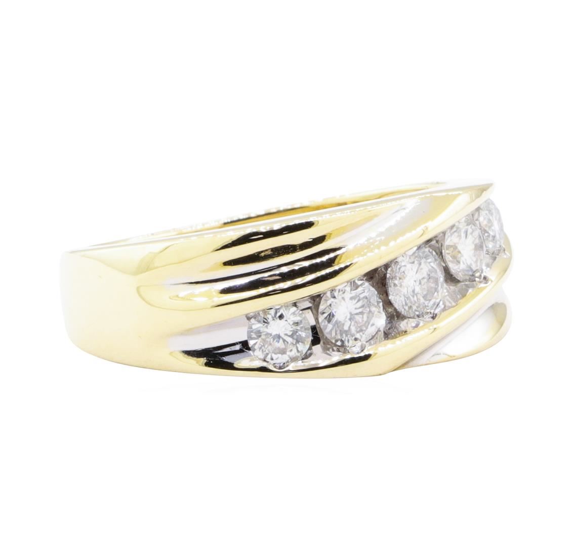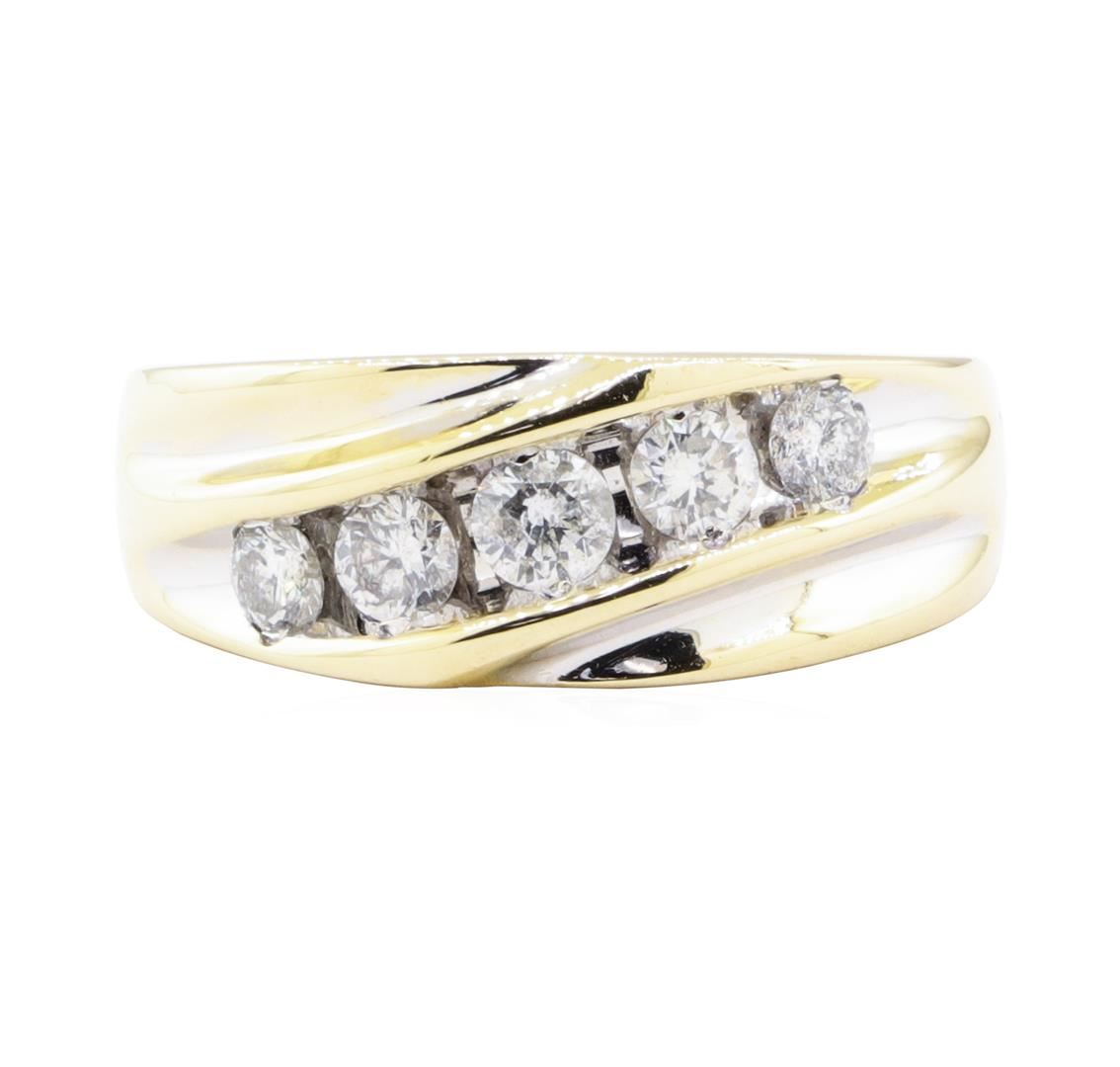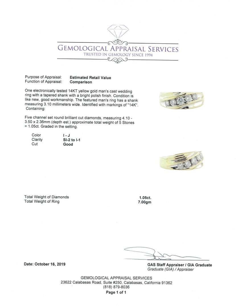 One electronically tested 14KT yellow gold man's cast wedding ring with a tapered shank with a bright polish finish. The featured man's ring has a shank measuring 3.10 millimeters wide. Identified with markings of '14K'. Condition is Good. Containing: Five channel set round brilliant cut diamonds, measuring 4.10 - 3.50 x 2.36mm (depth est.) approximate total weight of 5 Stones = 1.05ct. Graded in the setting. Color I - J Clarity SI-2 to I-1 Cut Good. Total Weight of Diamonds 1.05ct.. Total Weight of Ring 7.00gm GAS Appraised at $3895.00. GAS Appraised at $3,895.00.