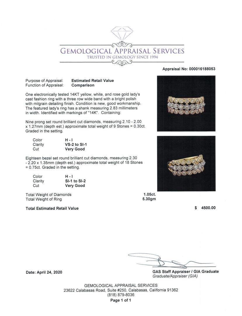 One electronically tested 14KT yellow, white, and rose gold lady's cast fashion ring with a three row wide band with a bright polish with milgrain detailing finish. The featured lady's ring has a shank measuring 2.83 millimeters in width. Identified with markings of '14K'. Condition is new, good workmanship. Containing: Nine prong set round brilliant cut diamonds, measuring 2.10 - 2.00 x 1.27mm (depth est.) approximate total weight of 9 Stones = 0.30 ct. Graded in the setting. Color H - I Clarity VS-2 to SI-1 Cut Very Good Eighteen bezel set round brilliant cut diamonds, measuring 2.30 - 2.20 x 1.35mm (depth est.) approximate total weight of 18 Stones = 0.75ct. Graded in the setting. Color H - I Clarity SI-1 to SI-2 Cut Very Good. Total Weight of Diamonds 1.05ct.. Total Weight of Ring 5.30gm GAS Appraised at $4500.00. GAS Appraised.