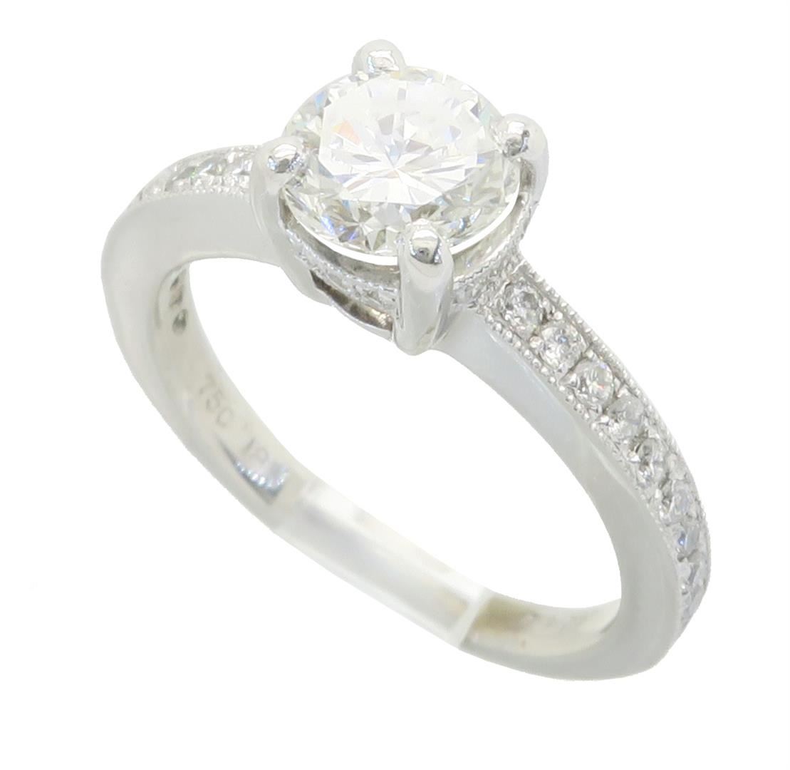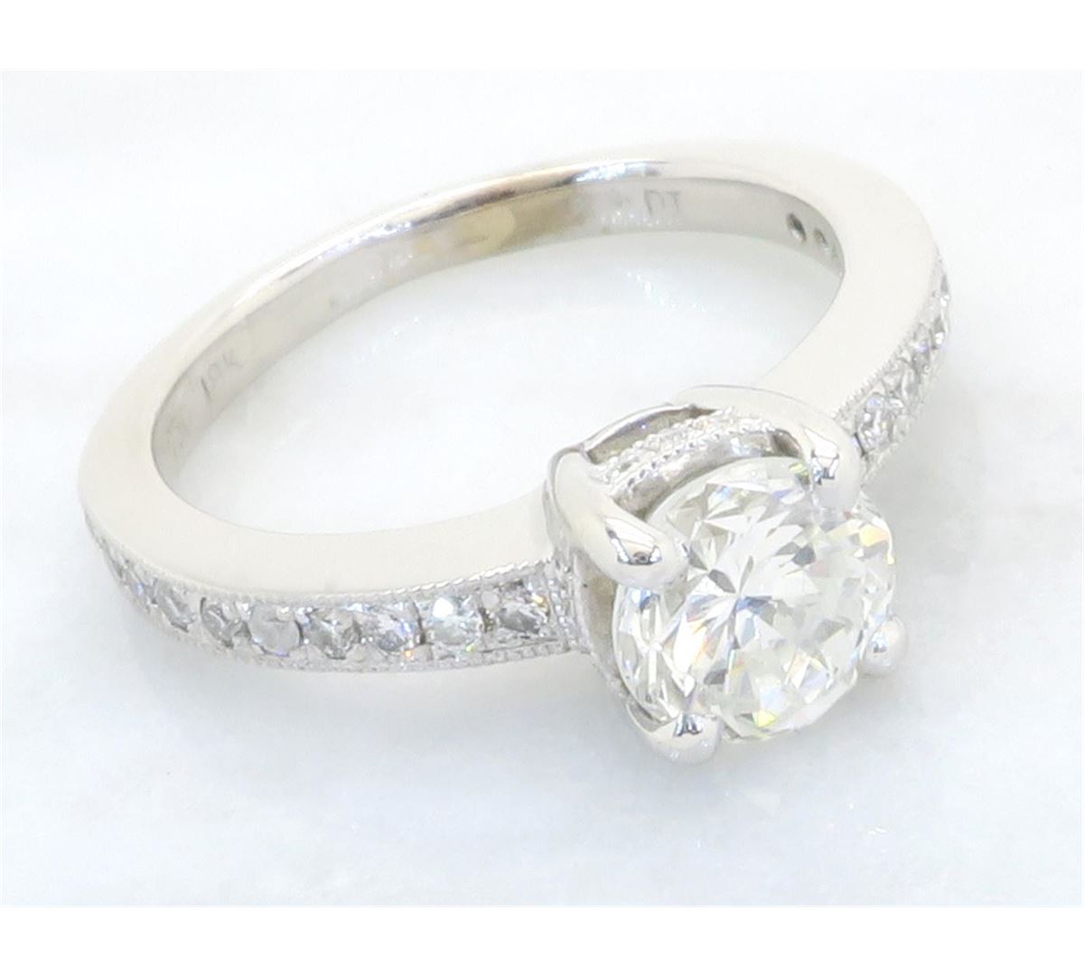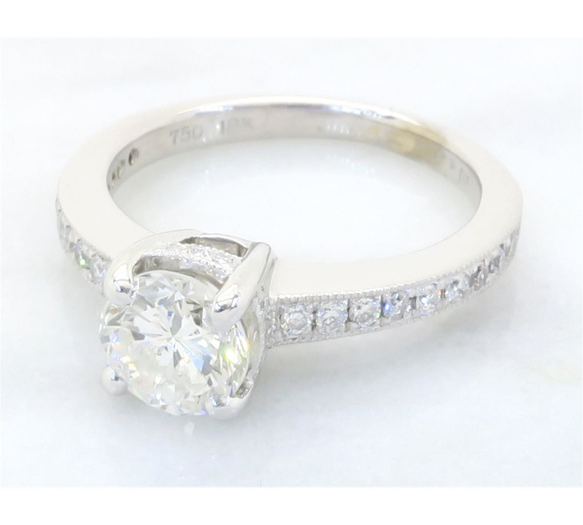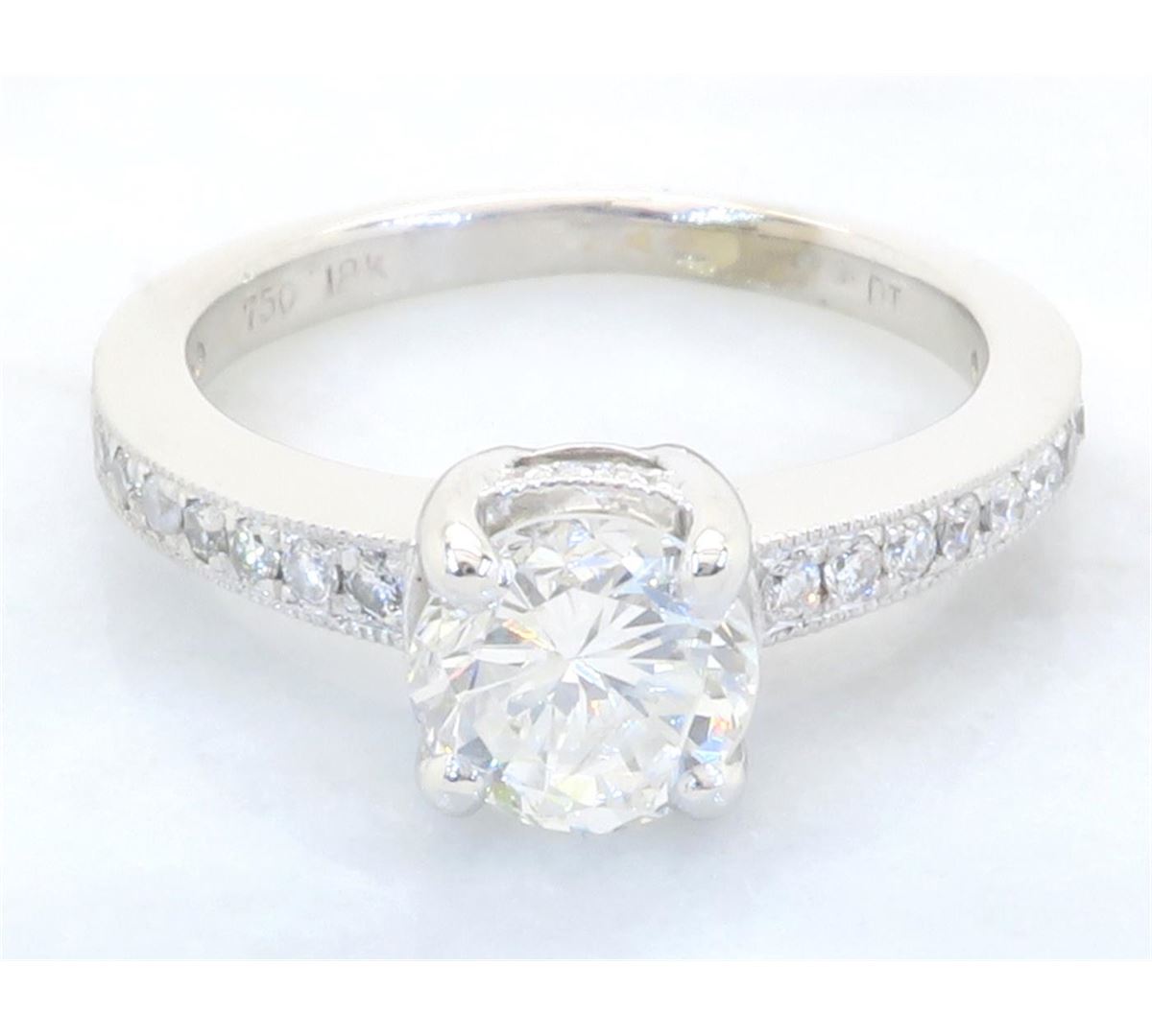 One tested 18K white gold diamond ring. Containing: One Round Brilliant Cut Diamond. Approximate Size: .75CT, Clarity: I1, Color: G-H. 32 Round Brilliant Cut Diamonds. Approximate total diamond weight: 1.05CTW. All diamonds are graded in the mounting unless otherwise stated. Weight of ring: 3.4 grams, Size: 3.75