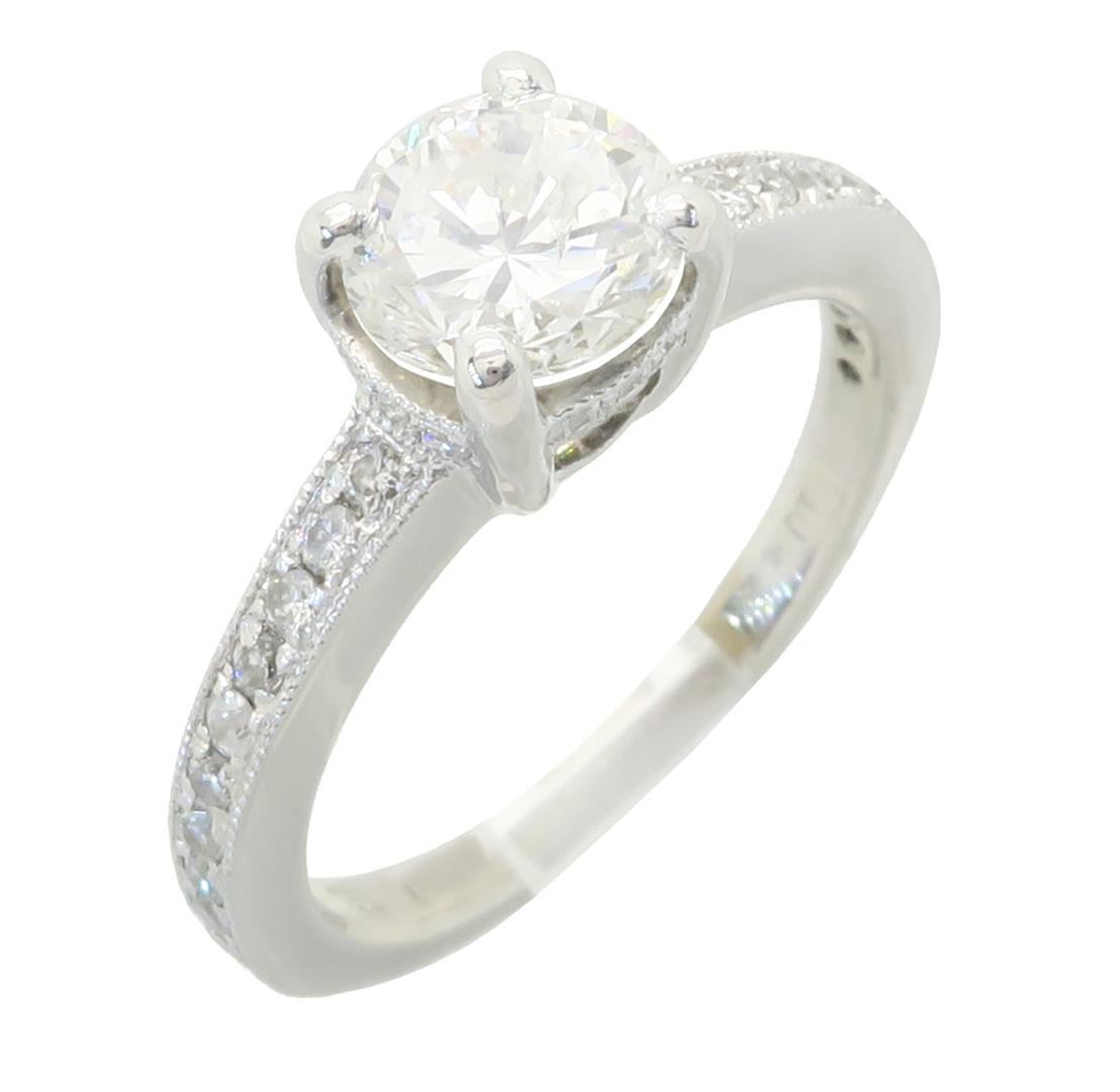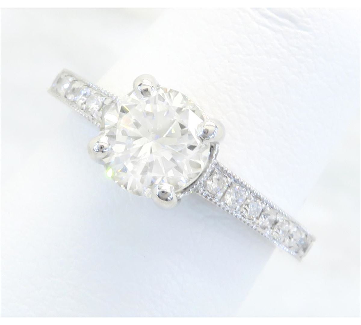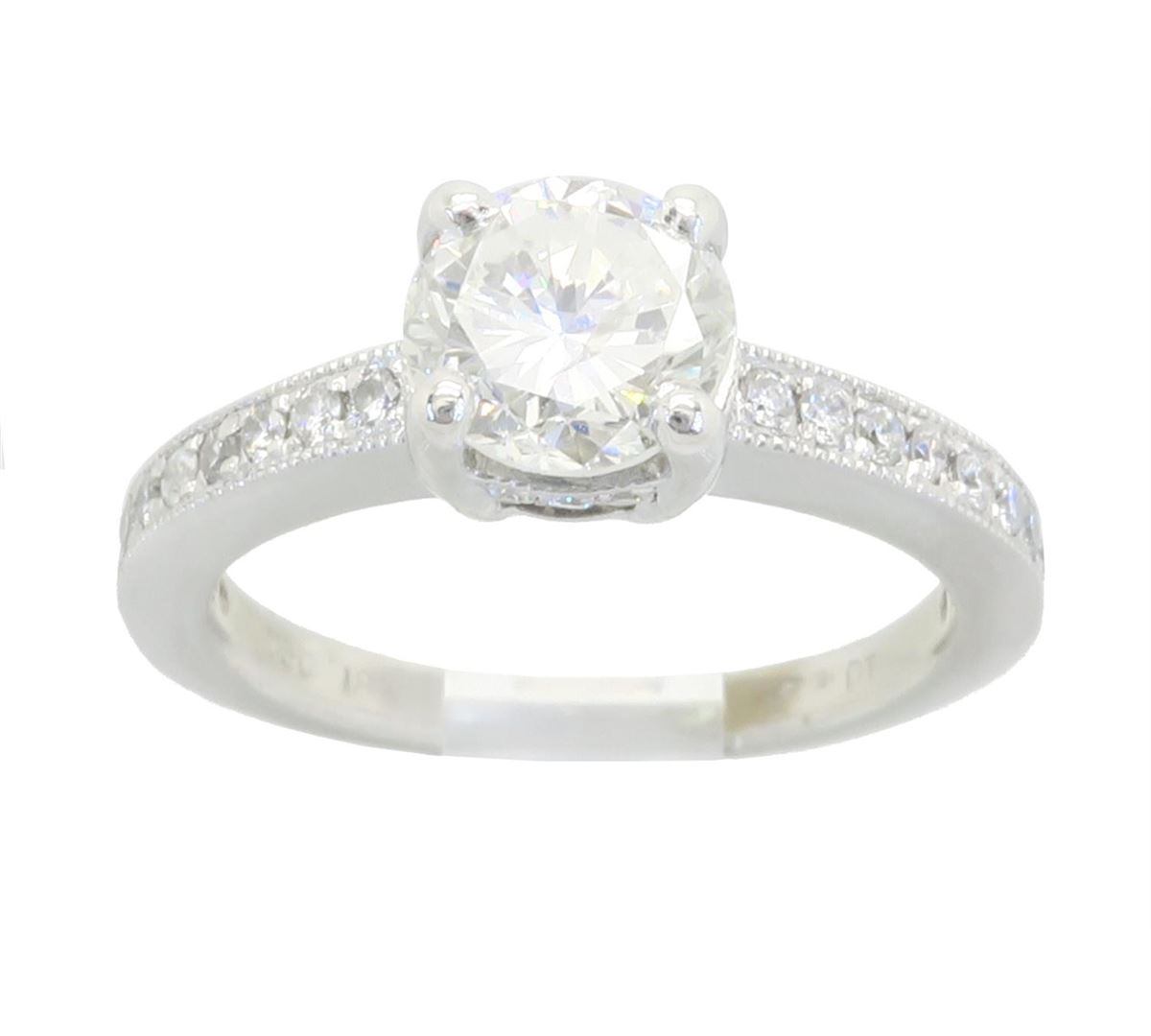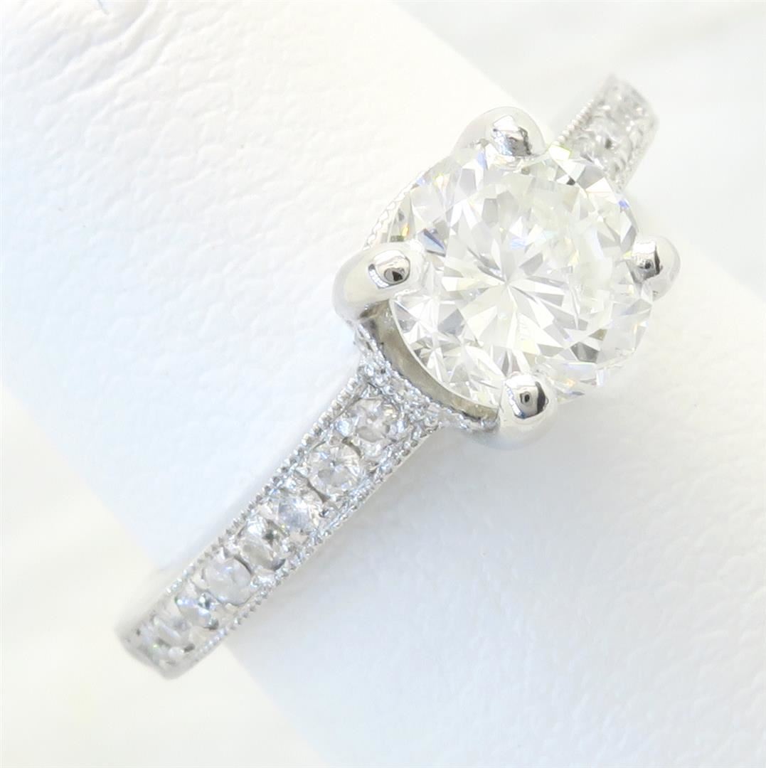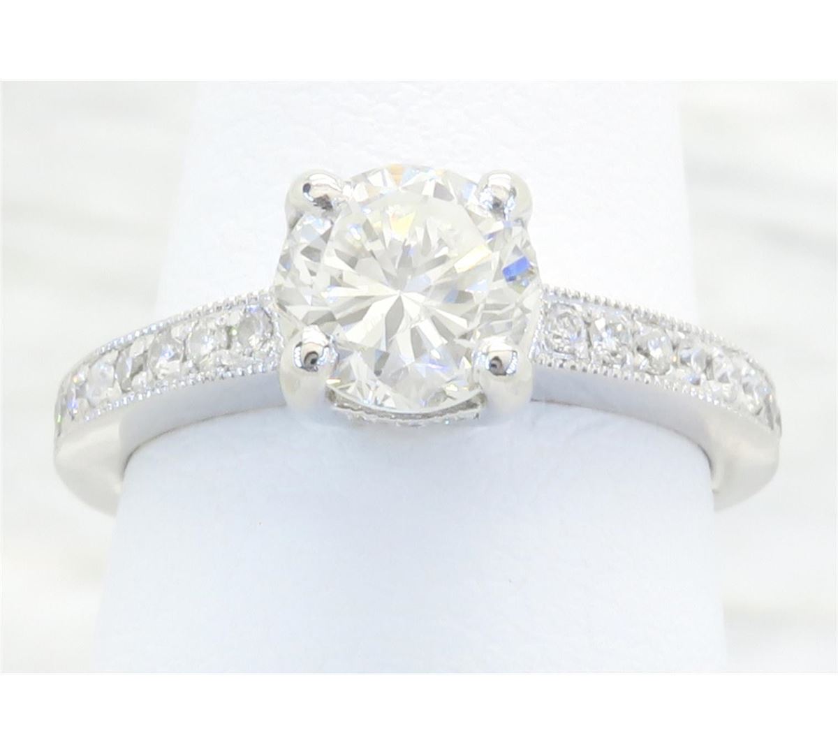 One tested 18K white gold diamond ring. Containing: One Round Brilliant Cut Diamond. Approximate Size: .75CT, Clarity: I1, Color: G-H. 32 Round Brilliant Cut Diamonds. Approximate total diamond weight: 1.05CTW. All diamonds are graded in the mounting unless otherwise stated. Weight of ring: 3.4 grams, Size: 3.75