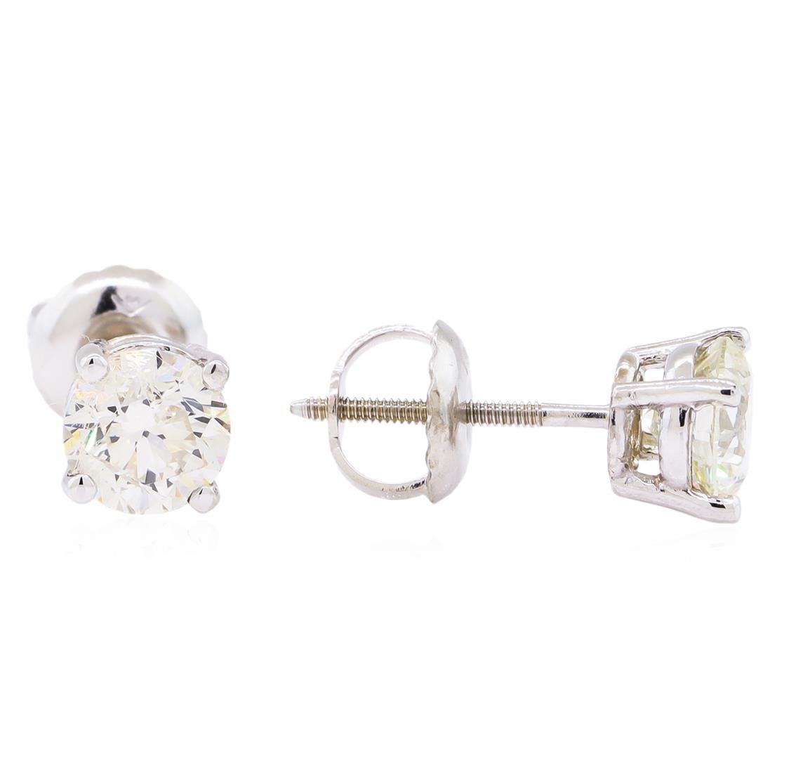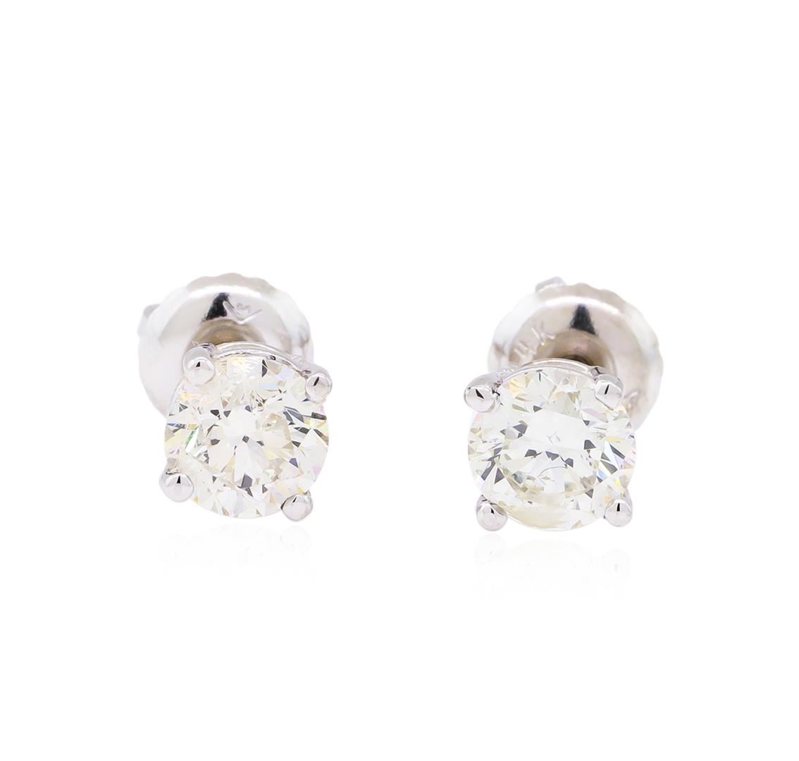 One pair electronically tested 14KT white gold lady's combination cast & assembled stud earrings with threaded posts and screw-on/screw-off backs with a bright polish finish. Identified with markings of "14K". Condition is new, good workmanship. Containing: Two prong set round brilliant cut diamonds, measuring 5.10 - 5.06 x 3.25mm (depth est.) approximate total weight of 2 Stones = 1.05ct. Graded in the setting. Clarity: SI-1 to SI-2. Color: H - I. Cut Very Good. Total Weight of Diamonds 1.05ct. Total Weight of Earrings 1.00gm. GAS Appraised at $7,120.00.