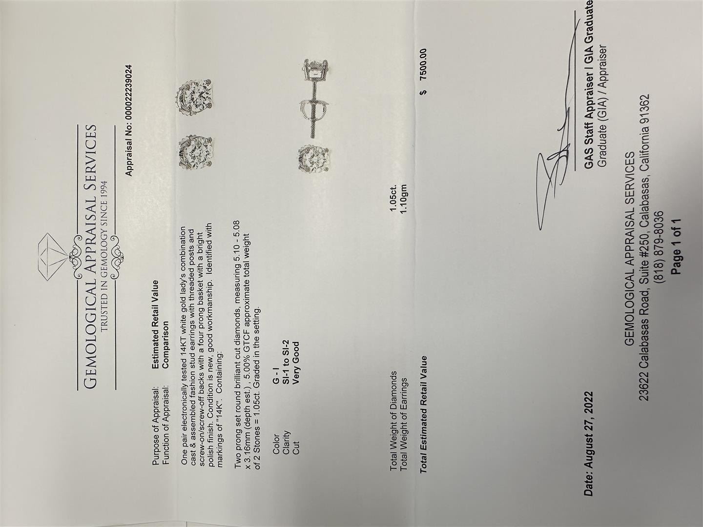 One pair electronically tested 14KT white gold lady's combination cast assembled fashion stud earrings with threaded posts and screw-on/screw-off backs with four prong basket with bright polish finish. Condition is new, good workmanship. Identified with markings of 14K. Containing: 2 prong set round brilliant cut diamonds, approximate total weight of 2 stones = 1.05 ctw. Graded in the setting. Total weight of Diamonds: 1.05 ctw. Total estimated retail value: $7500
