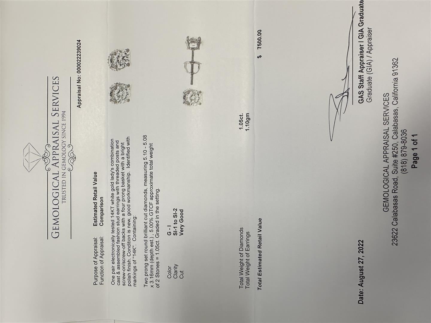 One pair electronically tested 14KT white gold lady's combination cast assembled fashion stud earrings with threaded posts and screw-on/screw-off backs with four prong basket with bright polish finish. Condition is new, good workmanship. Identified with markings of 14K. Containing: 2 prong set round brilliant cut diamonds, approximate total weight of 2 stones = 1.05 ctw. Graded in the setting. Total weight of Diamonds: 1.05 ctw. Total estimated retail value: $7500
