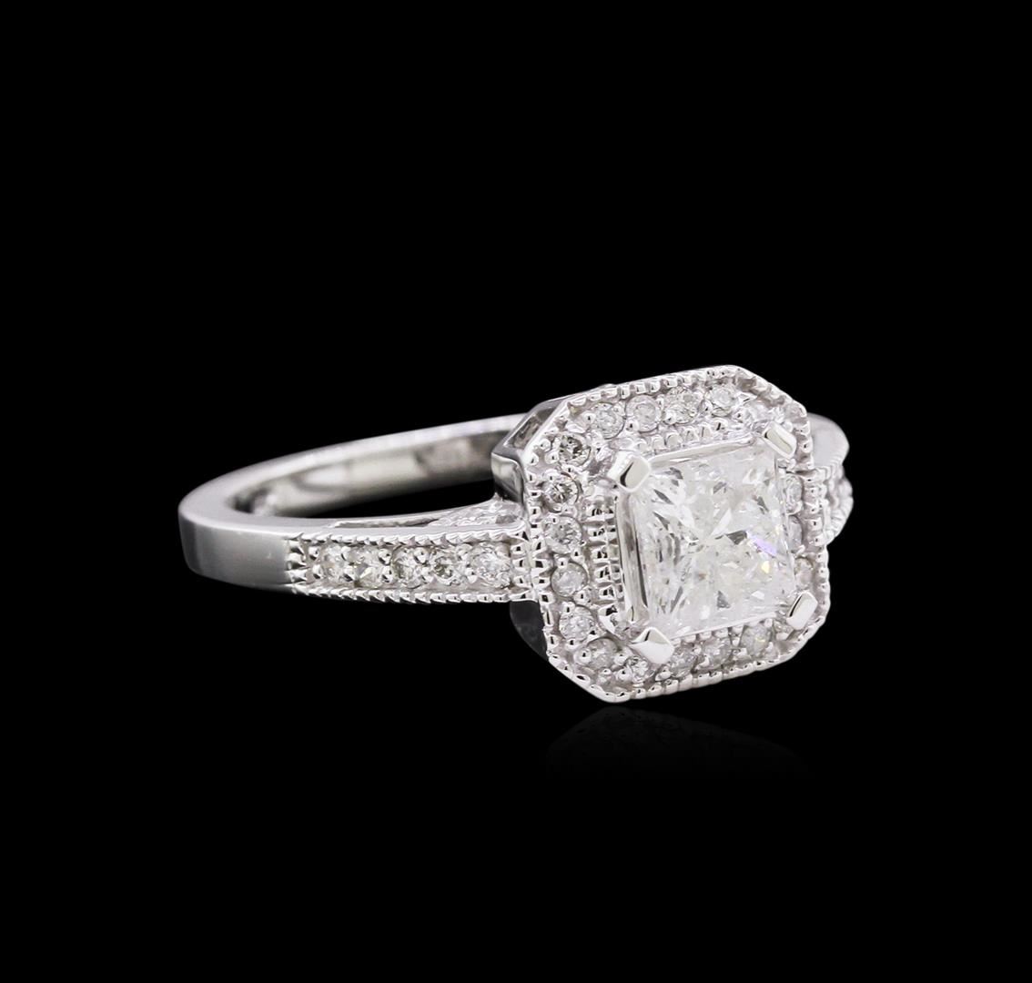 One electronically tested 14KT white gold ladies cast diamond unity ring. The featured diamond is set within a diamond bezel supported by a diamond accented under gallery and diamond set shoulders, completed by a one and one-half millimeter wide band. Bright polish finish with milgrain detailing throughout. Identified with markings of "14K". Condition is new, good workmanship. Containing: One prong set princess cut diamond, measuring 5.00 x 4.95 x 3.35mm exact weight 0.75ct. Graded in the setting. Clarity: I-2. Color: H. Depth 67.7%. Table 74.8%. Forty-Two prong set round brilliant cut diamonds, measuring 1.30 - 1.20 x 0.75mm exact total weight 42 Stones = 0.30ct. Graded in the setting. Clarity: SI-2 to I-1. Color: G - I. Total Weight of Diamonds 1.05ct. Total Weight of Ring 3.86gm. AIG Appraised at $4,475.00.