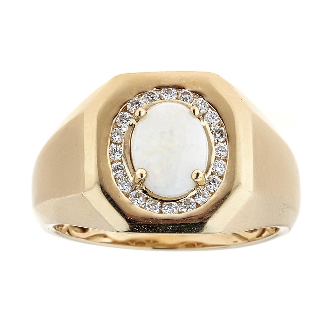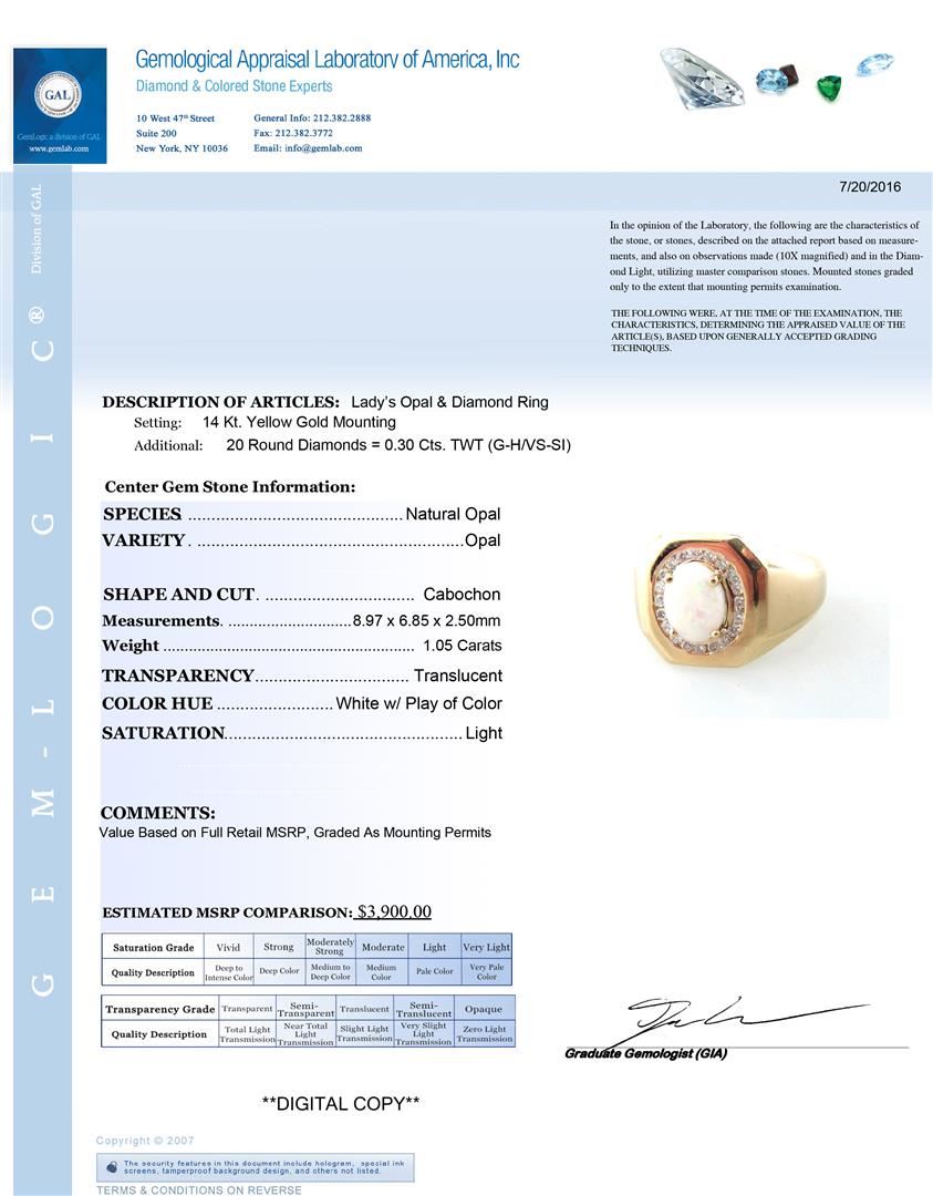One Lady's Opal and Diamond Ring. Setting: 14 Kt. Yellow Gold Mounting. Additional: 20 Round Diamonds = 0.30 Cts. TWT (G-H/VS-SI). Center Gem Stone Information: Species: Natural Opal. Variety: Opal. Shape and Cut: Cabochon. Measurements: 8.97 x 6.85 x 2.50 mm. Weight: 1.05 Carats. Transparency: Translucent. Color Hue: White with Play of Color. Saturation: Light. Total Weight: 8.35 grams.