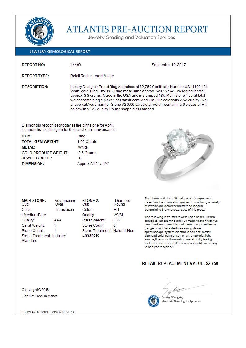 14403 - REF-41H8M ---- 1.06 CTW Aquamarine & Diamond Ring 18K White Gold ---- Luxury Designer Brand Ring Appraised at $2,750 Certificate Number US14403  18k White gold,  Ring Size is 6, Ring measuring approx. 5/16" x  1/4" , weighing in total approx. 3.3 grams. Made in the USA and is stamped 18k, Main stone 1 carat total weight containing 1 pieces of Translucent Medium Blue color with AAA quality Oval shape cut Aquamarine , Stone #2 0.06 carat total weight containing 6 pieces of H-I color with  VS/SI quality Round shape cut Diamond