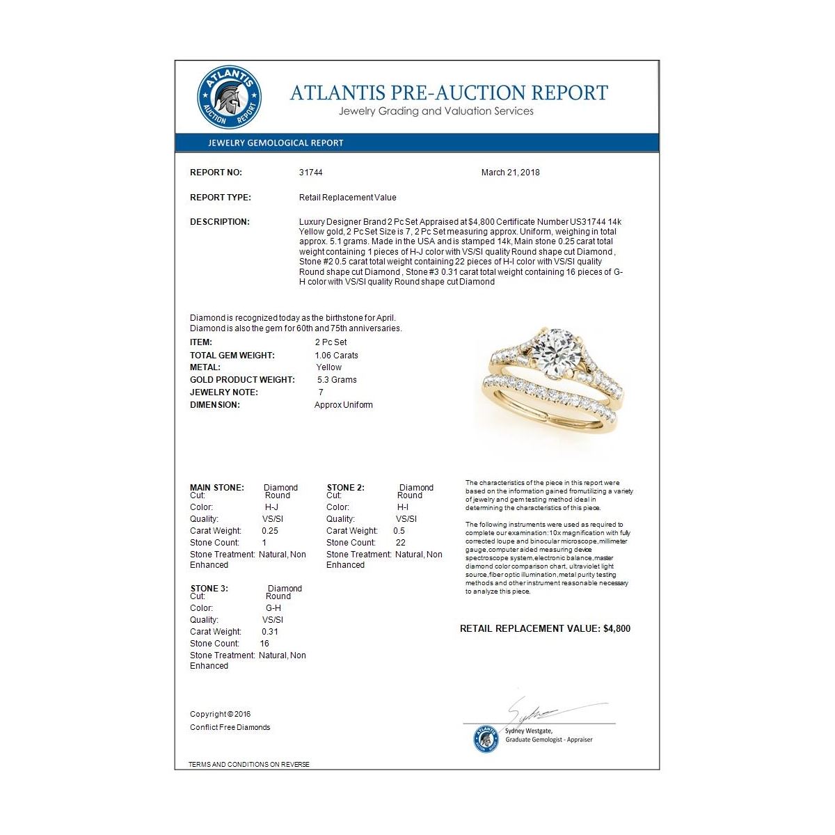 REF-96M5H -31744 ---- 1.06 CTW Certified VS/SI Diamond Solitaire 2Pc Wedding Set 14K Yellow Gold ---- Luxury Designer Brand 2 Pc Set Appraised at $4,800 Certificate Number US31744 14k Yellow gold, 2 Pc Set Size is 7, 2 Pc Set measuring approx. Uniform, weighing in total approx. 5.1 grams. Made in the USA and is stamped 14k, Main stone 0.25 carat total weight containing 1 pieces of H-J color with VS/SI quality Round shape cut Diamond , Stone #2 0.5 carat total weight containing 22 pieces of H-I color with VS/SI quality Round shape cut Diamond , Stone #3 0.31 carat total weight containing 16 pieces of G-H color with VS/SI quality Round shape cut Diamond