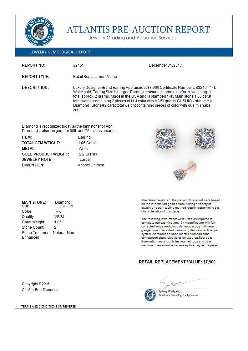 REF-148T5M -32151 ---- 1.06 CTW Cushion Cut VS/SI Diamond Stud Designer Earrings 14K White Gold ---- Luxury Designer Brand Earring Appraised at $7,900 Certificate Number US32151 14k White gold, Earring Size is Larger, Earring measuring approx. Uniform, weighing in total approx. 2 grams. Made in the USA and is stamped 14k, Main stone 1.06 carat total weight containing 2 pieces of H-J color with VS/SI quality CUSHION shape cut Diamond , Stone #2 carat total weight containing pieces of color with quality shape cut