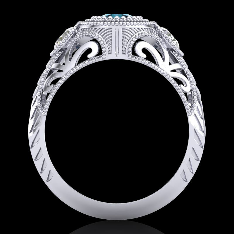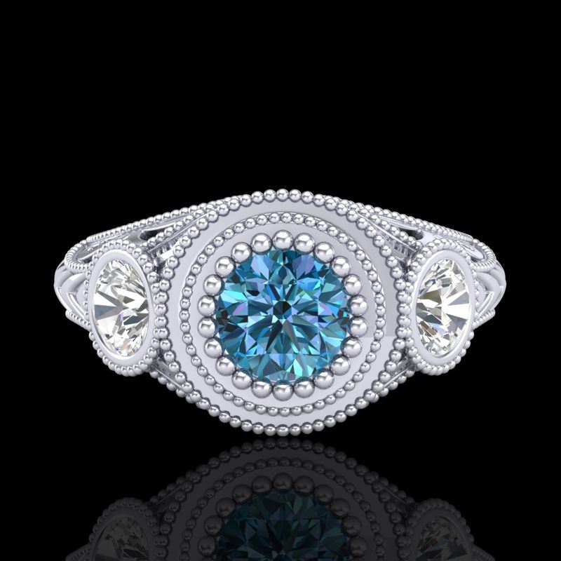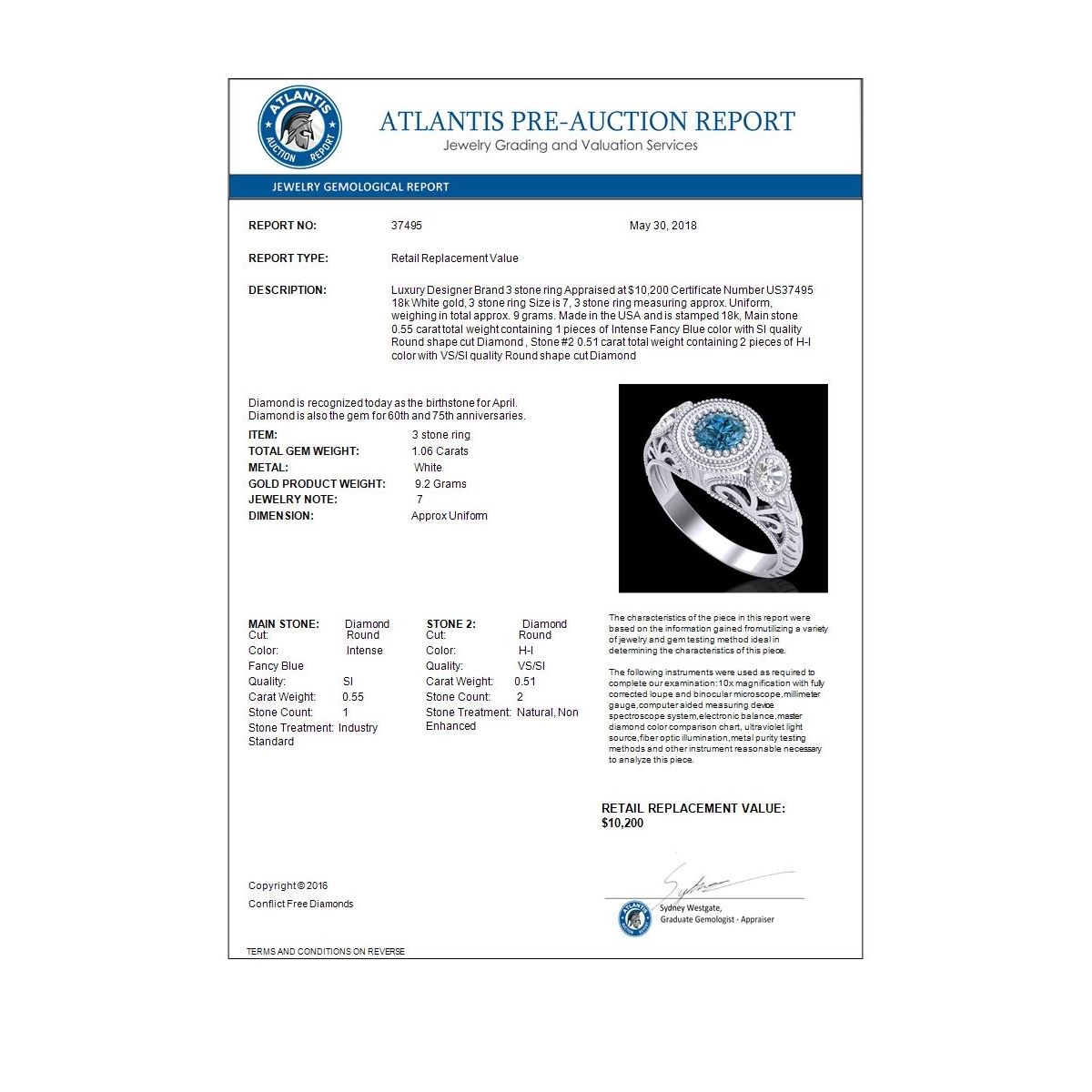 REF-154F5N -37495 ---- 1.06 CTW Fancy Intense Blue Diamond Art Deco 3 Stone Ring 18K White Gold ---- Luxury Designer Brand 3 stone ring Appraised at $10,200 Certificate Number US37495 18k White gold, 3 stone ring Size is 7, 3 stone ring measuring approx. Uniform, weighing in total approx. 9 grams. Made in the USA and is stamped 18k, Main stone 0.55 carat total weight containing 1 pieces of Intense Fancy Blue color with SI quality Round shape cut Diamond , Stone #2 0.51 carat total weight containing 2 pieces of H-I color with VS/SI quality Round shape cut Diamond