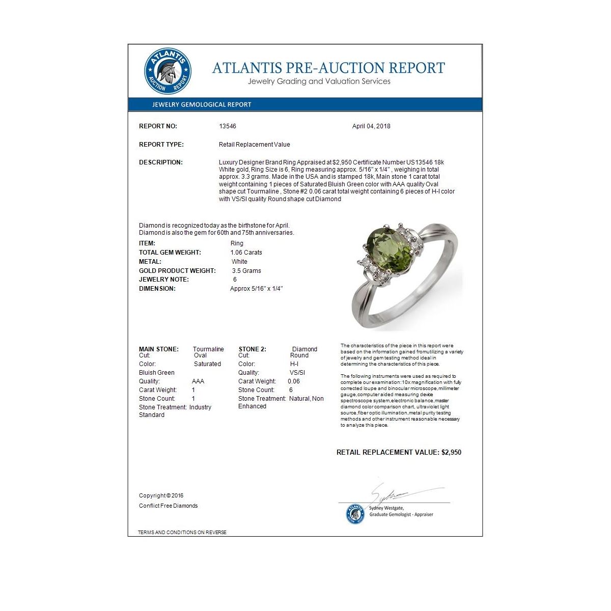 REF-38H4A -13546 ---- 1.06 CTW Green Tourmaline & Diamond Ring 18K White Gold ---- Luxury Designer Brand Ring Appraised at $2,950 Certificate Number US13546 18k White gold, Ring Size is 6, Ring measuring approx. 5/16" x 1/4" , weighing in total approx. 3.3 grams. Made in the USA and is stamped 18k, Main stone 1 carat total weight containing 1 pieces of Saturated Bluish Green color with AAA quality Oval shape cut Tourmaline , Stone #2 0.06 carat total weight containing 6 pieces of H-I color with VS/SI quality Round shape cut Diamond