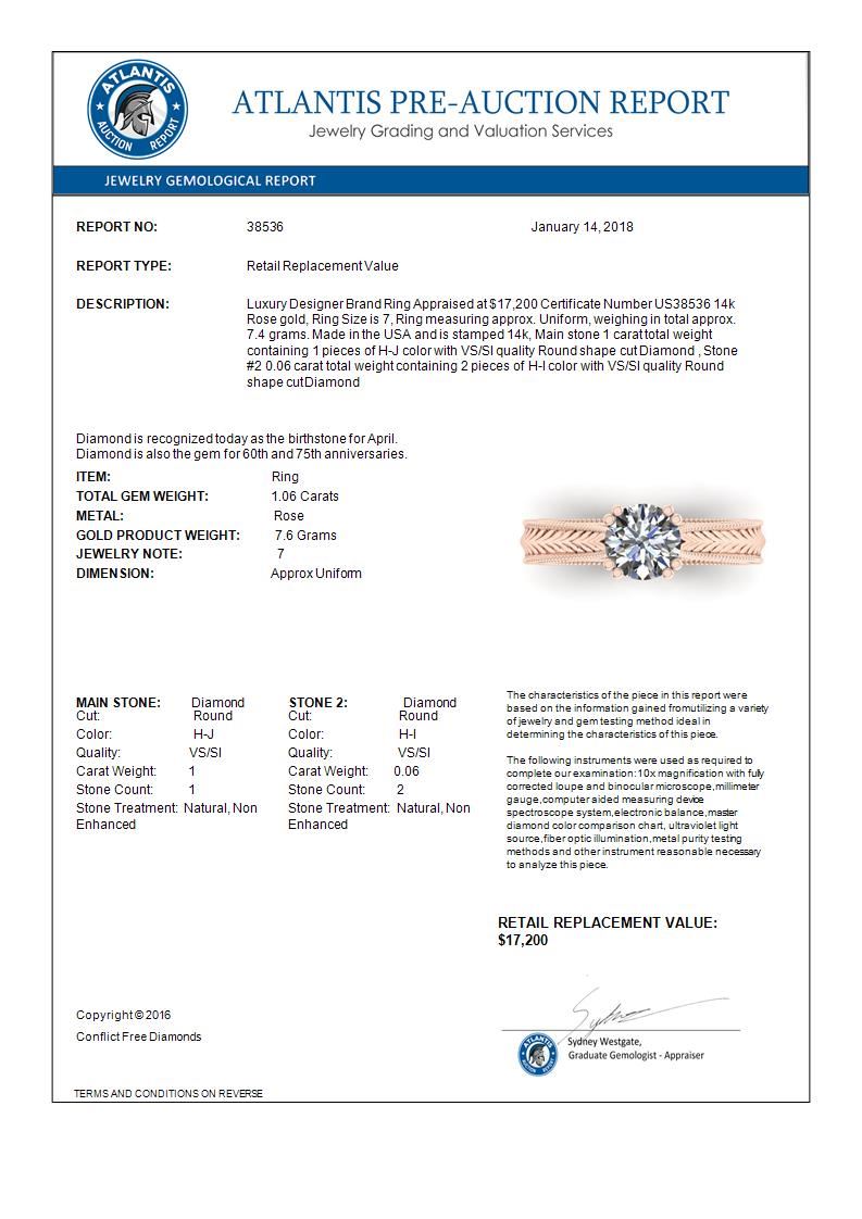 REF-286K6W -38536 ---- 1.06 CTW Solitaire Certified VS/SI Diamond Ring 14K Rose Gold ---- Luxury Designer Brand Ring Appraised at $17,200 Certificate Number US38536 14k Rose gold, Ring Size is 7, Ring measuring approx. Uniform, weighing in total approx. 7.4 grams. Made in the USA and is stamped 14k, Main stone 1 carat total weight containing 1 pieces of H-J color with VS/SI quality Round shape cut Diamond , Stone #2 0.06 carat total weight containing 2 pieces of H-I color with VS/SI quality Round shape cut Diamond