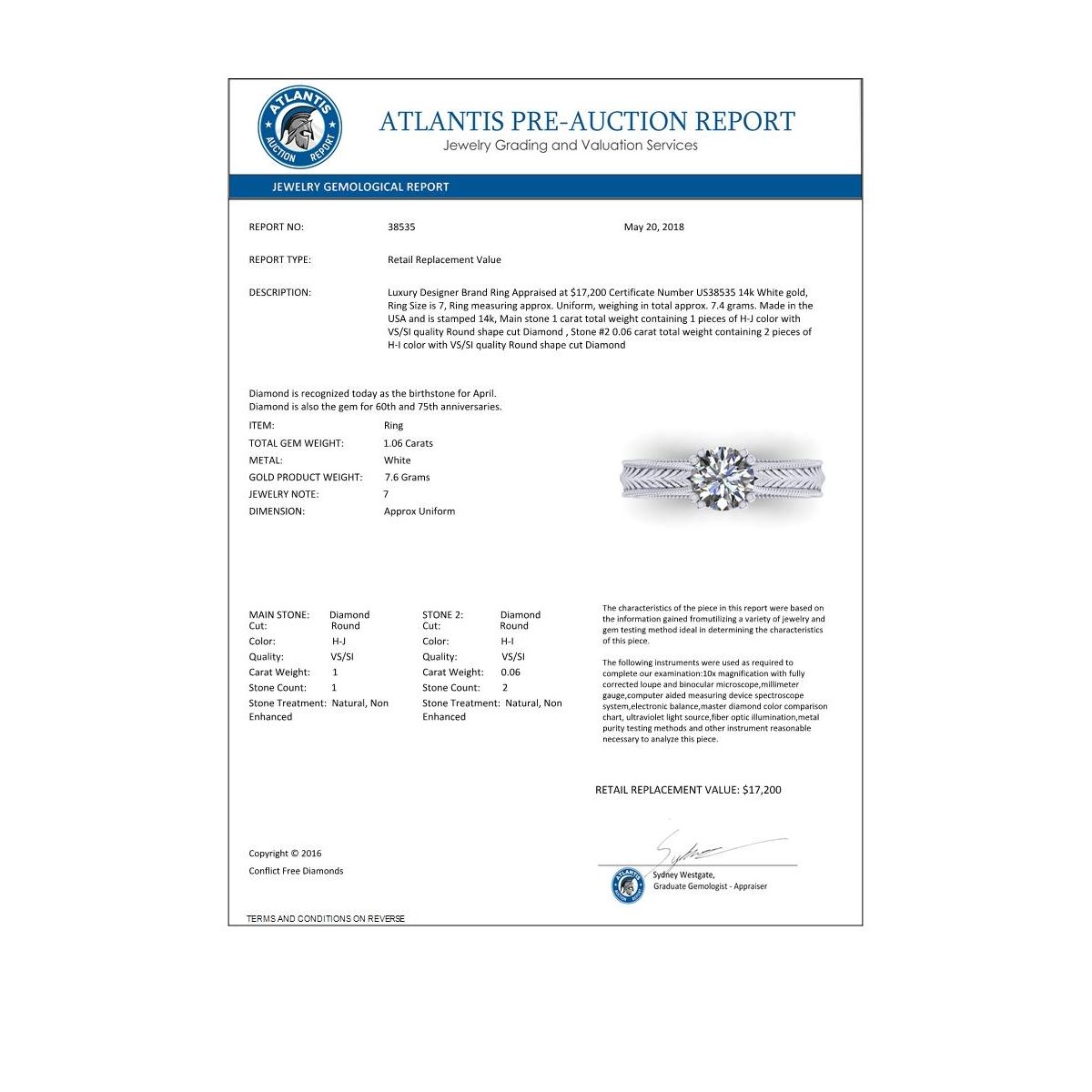 REF-286M6H -38535 ---- 1.06 CTW Solitaire Certified VS/SI Diamond Ring 14K White Gold ---- Luxury Designer Brand Ring Appraised at $17,200 Certificate Number US38535 14k White gold, Ring Size is 7, Ring measuring approx. Uniform, weighing in total approx. 7.4 grams. Made in the USA and is stamped 14k, Main stone 1 carat total weight containing 1 pieces of H-J color with VS/SI quality Round shape cut Diamond , Stone #2 0.06 carat total weight containing 2 pieces of H-I color with VS/SI quality Round shape cut Diamond