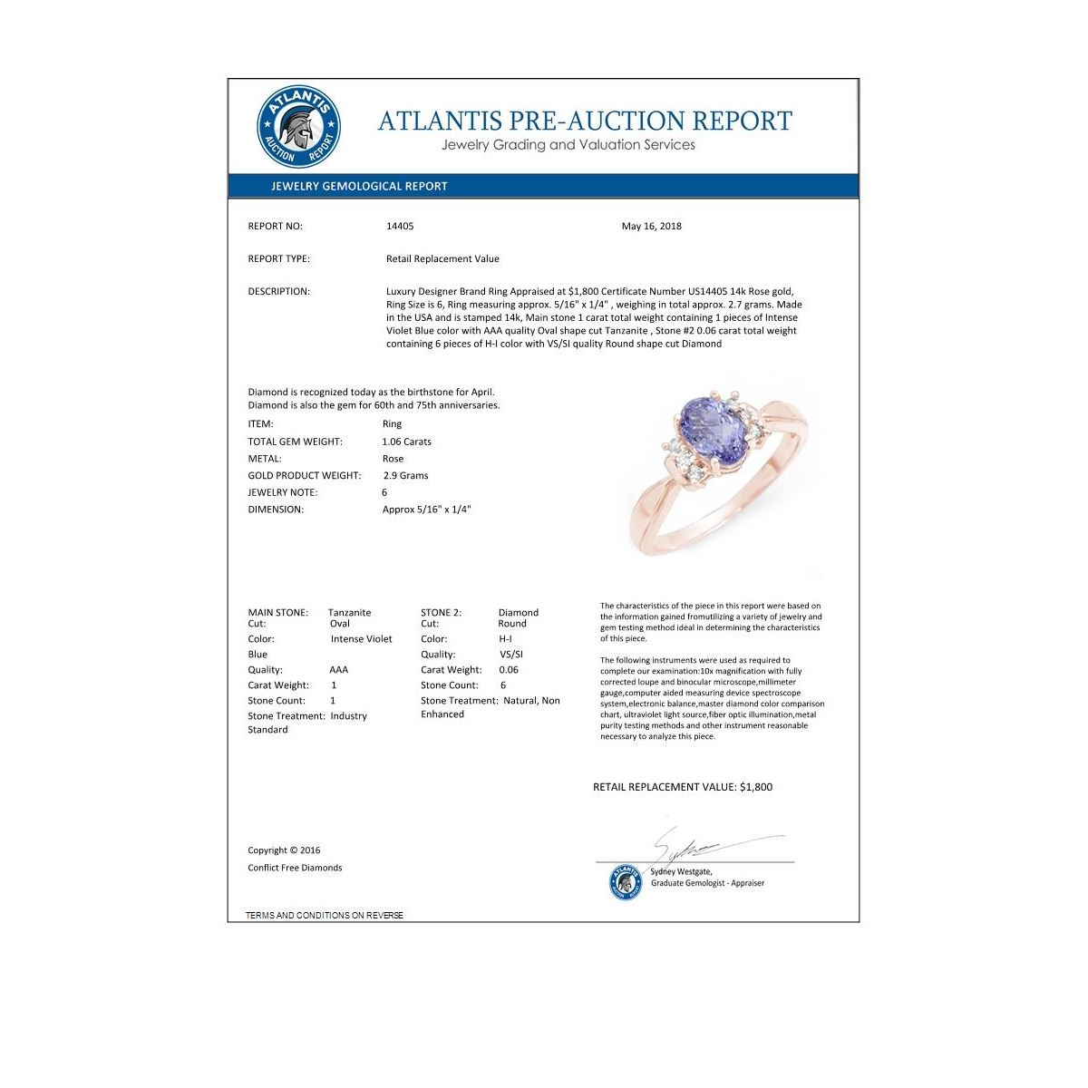 REF-25M3H -14405 ---- 1.06 CTW Tanzanite & Diamond Ring 14K Rose Gold ---- Luxury Designer Brand Ring Appraised at $1,800 Certificate Number US14405 14k Rose gold, Ring Size is 6, Ring measuring approx. 5/16" x 1/4" , weighing in total approx. 2.7 grams. Made in the USA and is stamped 14k, Main stone 1 carat total weight containing 1 pieces of Intense Violet Blue color with AAA quality Oval shape cut Tanzanite , Stone #2 0.06 carat total weight containing 6 pieces of H-I color with VS/SI quality Round shape cut Diamond