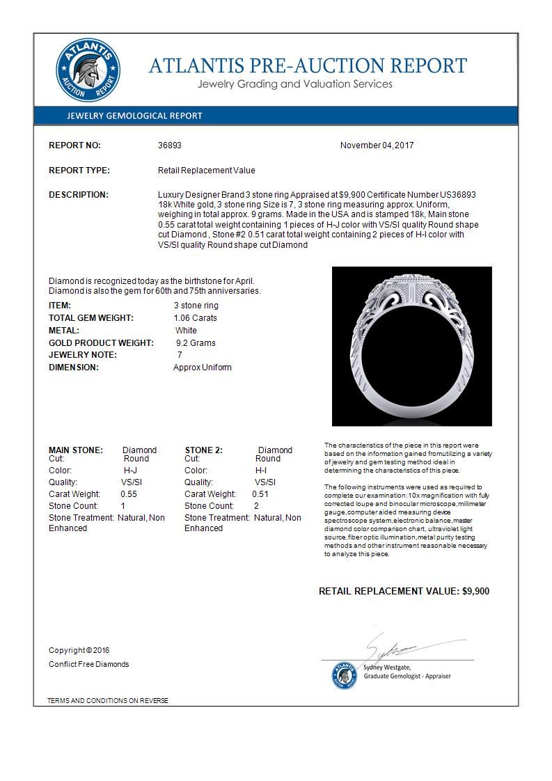 REF-180W2F -36893 ---- 1.06 CTW VS/SI Diamond Solitaire Art Deco 3 Stone Ring 18K White Gold ---- Luxury Designer Brand 3 stone ring Appraised at $9,900 Certificate Number US36893 18k White gold, 3 stone ring Size is 7, 3 stone ring measuring approx. Uniform, weighing in total approx. 9 grams. Made in the USA and is stamped 18k, Main stone 0.55 carat total weight containing 1 pieces of H-J color with VS/SI quality Round shape cut Diamond , Stone #2 0.51 carat total weight containing 2 pieces of H-I color with VS/SI quality Round shape cut Diamond