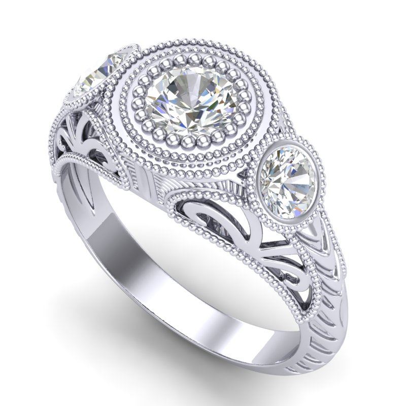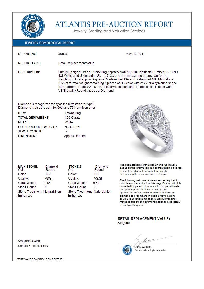 1.06 CTW VS/SI Diamond Solitaire Art Deco 3 Stone Ring 18K White Gold ---- Luxury Designer Brand 3 stone ring Appraised Retail Price at $10,900 ---- SKU Number US36893 18k White gold 3 stone ring Size is 7, 3 stone ring measuring approx. Uniform, weighing in total approx. 9 grams. Made in the USA and is stamped 18k, Main stone 0.55 carat total weight containing 1 pieces of H-J color with VS/SI quality Round shape cut Diamond , Stone #2 0.51 carat total weight containing 2 pieces of H-I color with VS/SI quality Round shape cut