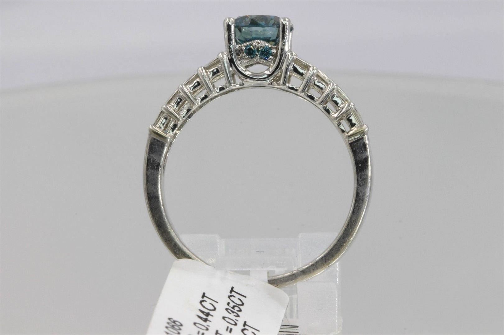 One lady's wedding ring featuring: 14KT white gold weighing 4.17 grams containing one color enhanced blue diamond weighing 1.06ct and blue and white diamonds weighing 0.79ctw. The blue diamond is round brilliant cut with fine clarity, fancy blue color and