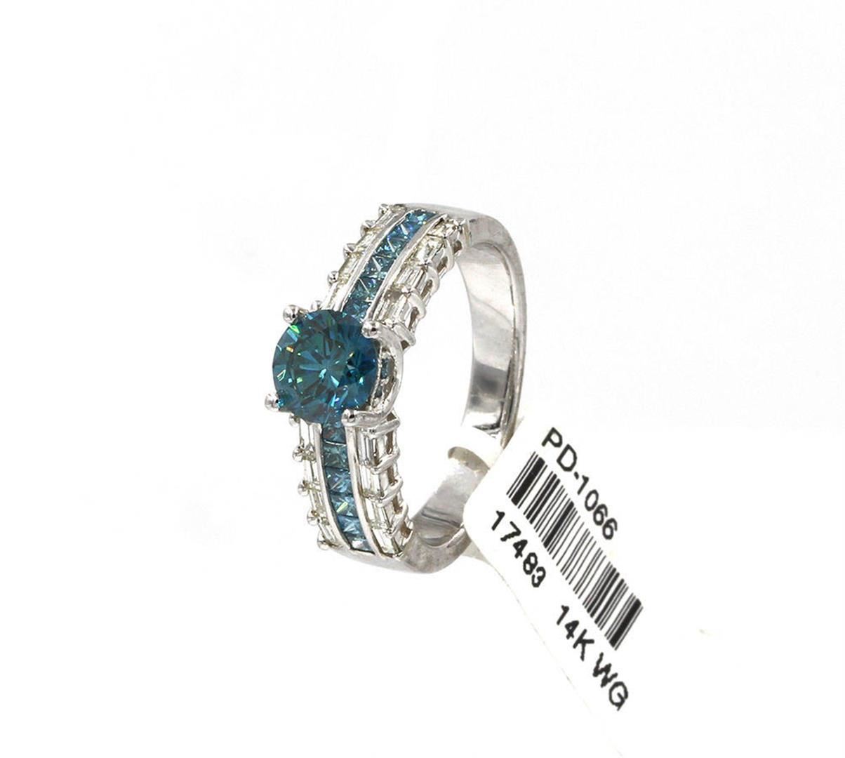 One lady's wedding ring featuring: 14KT white gold weighing 4.17 grams containing one color enhanced blue diamond weighing 1.06ct and blue and white diamonds weighing 0.79ctw. The blue diamond is round brilliant cut with fine clarity, fancy blue color and