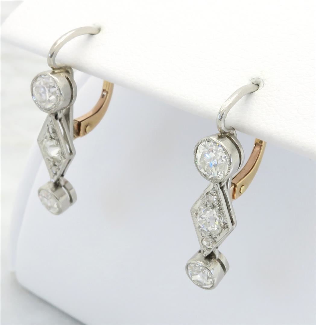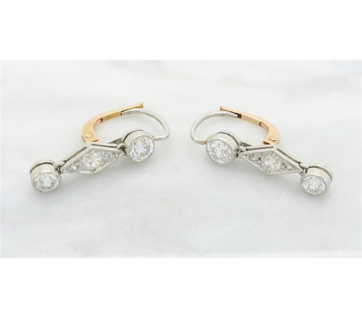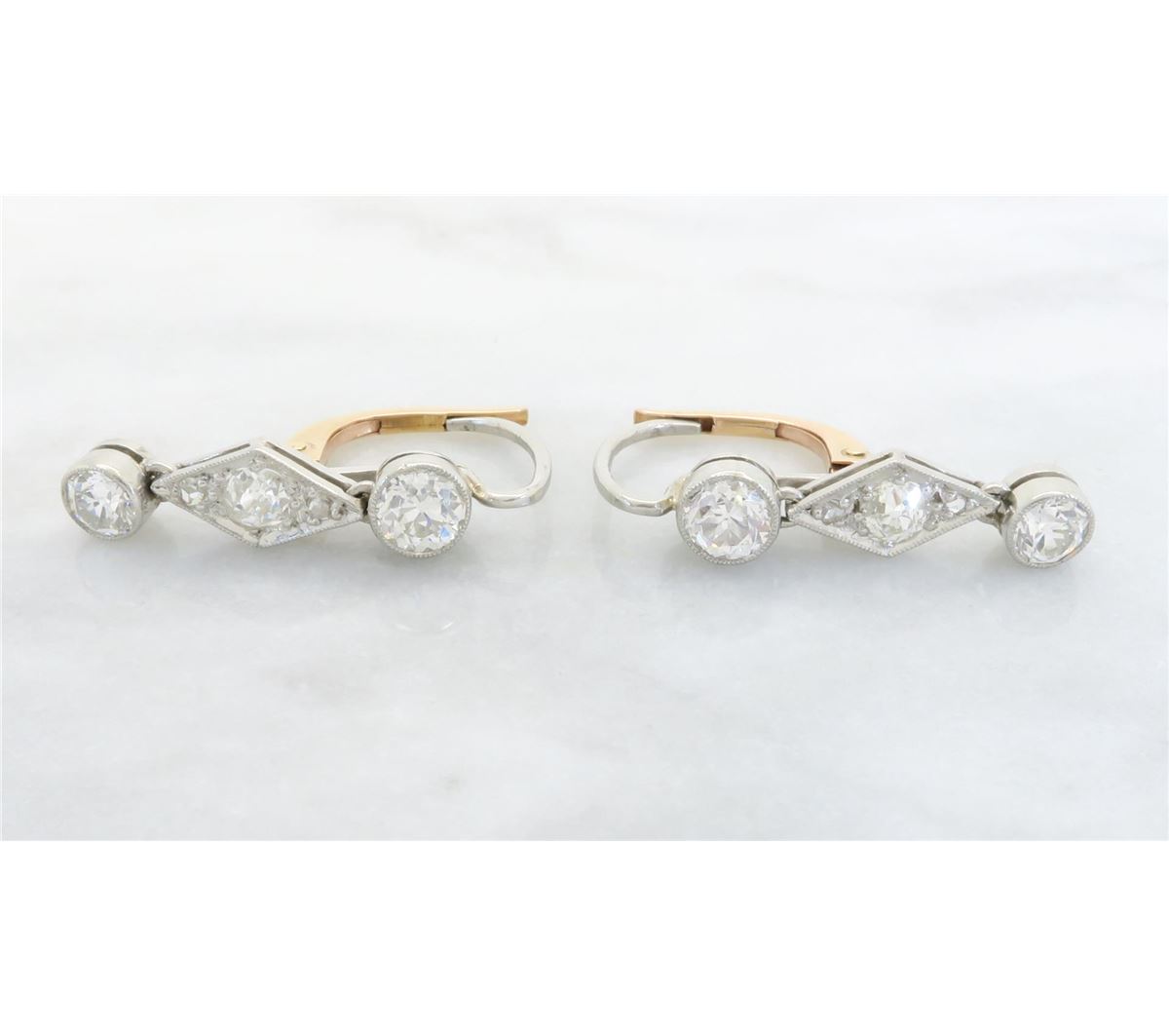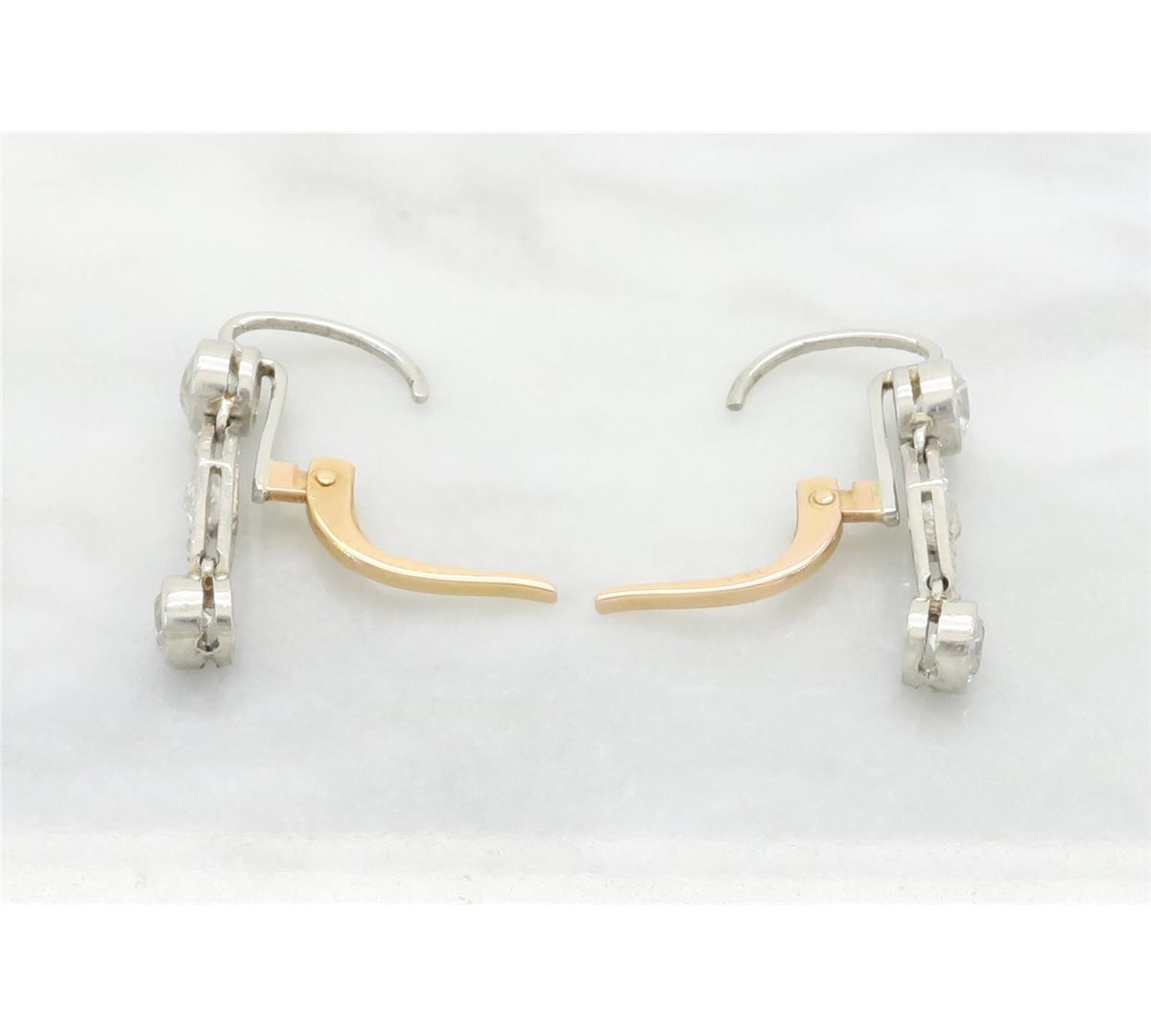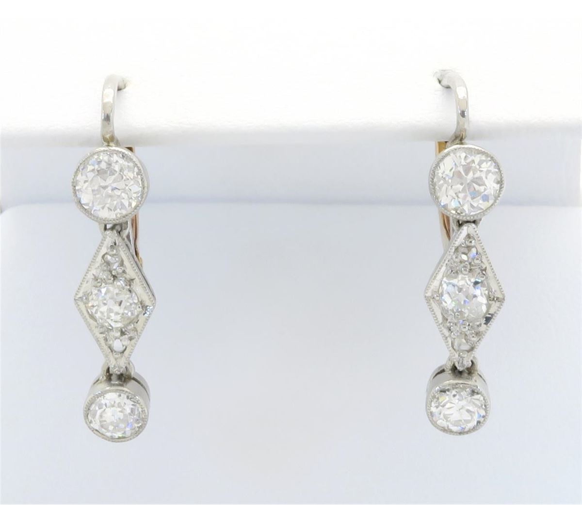 One pair of tested platinum earrings with 18K gold lever backs. Containing: Four Old European Cut Diamonds, Two Old Mine Cut Diamonds and Four Rose Cut Diamonds. Clarity: VS-SI, Color: F-H. Approximate total diamond weight: 1.06CTW. All diamonds are graded in the mounting unless otherwise stated. Weight of earrings: 3.3 grams.