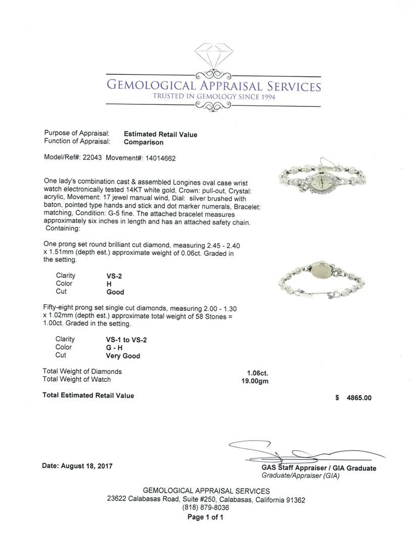 One lady's, combination cast & assembled Longines oval case wrist watch electronically tested 14KT white gold, Crown: pull-out, Crystal: acrylic, Movement: 17 jewel manual wind, Dial: silver brushed with baton, pointed type hands and stick and dot marker numerals, Bracelet: matching, Condition: G-5 fine. The attached bracelet measures approximately six inches in length and has an attached safety chain. Containing: One prong set round brilliant cut diamond, measuring 2.45 - 2.40 x 1.51mm (depth est.) approximate weight of 0.06ct. Graded in the setting. Color H Clarity VS-2 Cut Good Fifty-Eight prong set single cut diamonds, measuring 2.00 - 1.30 x 1.02mm (depth est.) approximate total weight of 58 Stones = 1.00ct. Graded in the setting. Color G - H Clarity VS-1 to VS-2 Cut Very Good. Total Weight of Diamonds 1.06ct.. Total Weight of Watch 19.00gm GAS Appraised at $4865.00. GAS Appraised at $4,865.00.